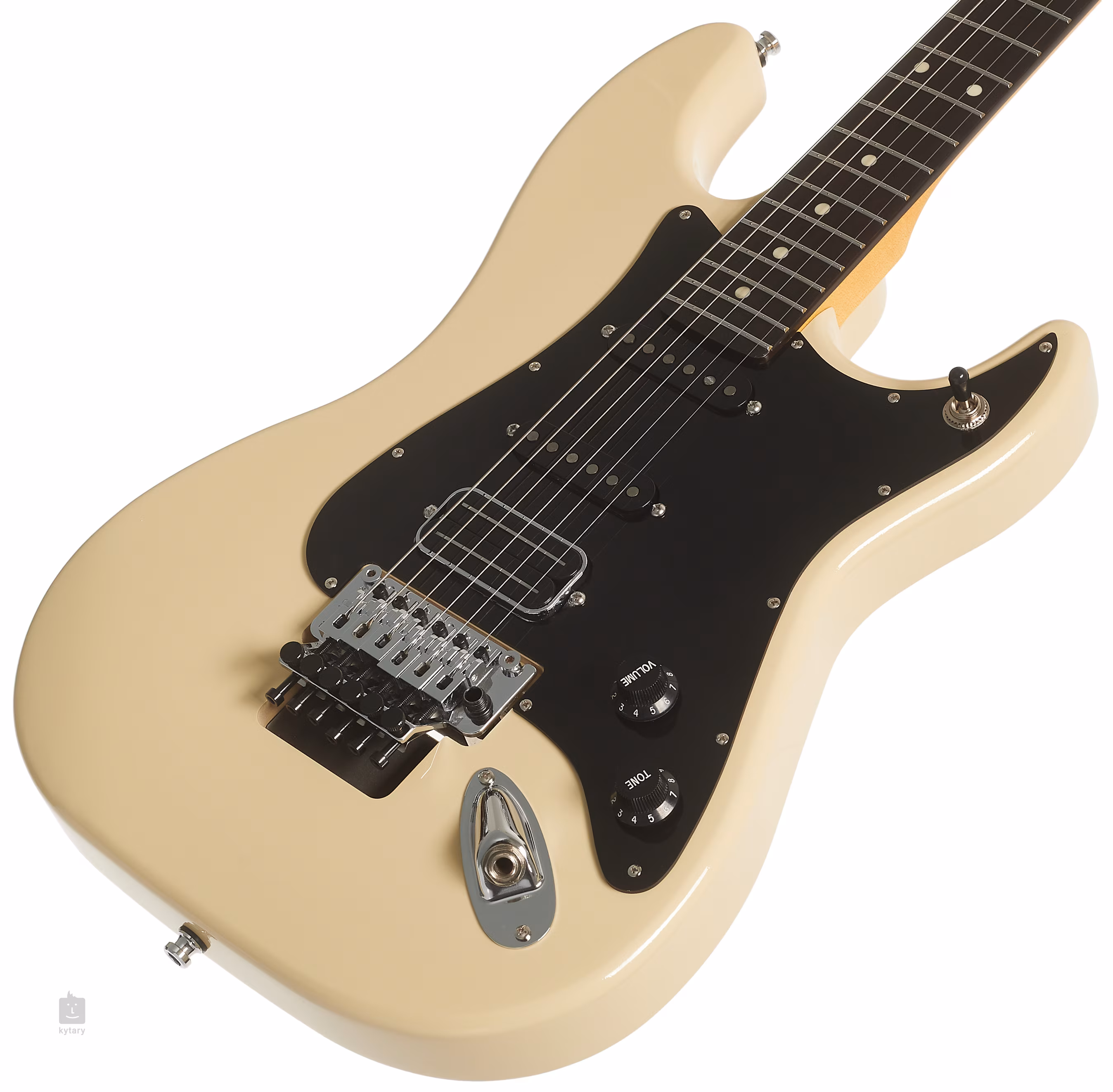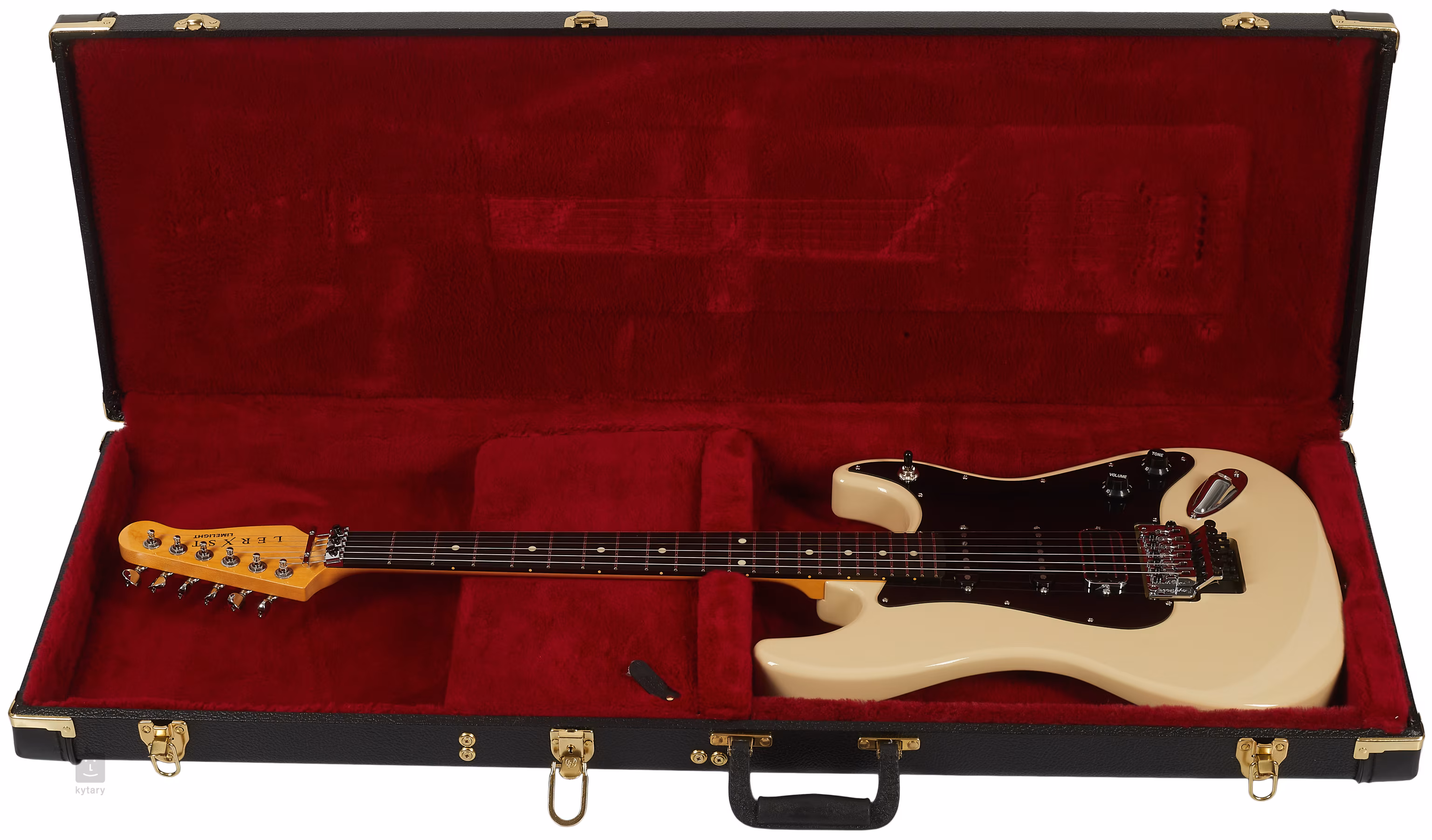 Der Korpus der LERXST Limelight Cream w/Floyd Rose with Case ist aus Sumpfesche gefertigt. Auf den Ahornhals ist ein Ebenholz-Griffbrett geklebt, das mit zweiundzwanzig Medium-Size-Bünden aus Edelstahl bestückt ist.