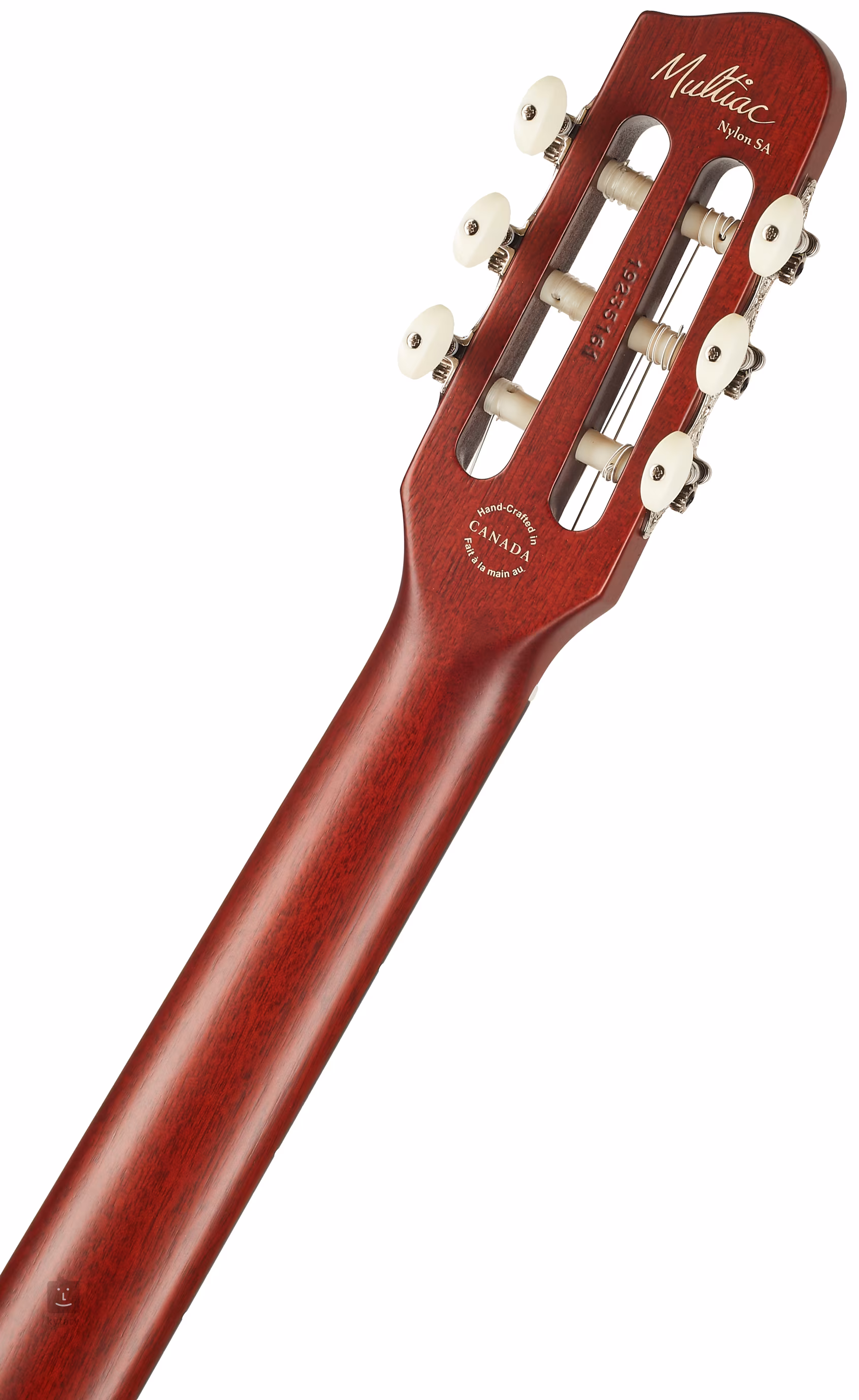 Die Basis des Sounds des Modells Multiac Nylon SA Natural HG besteht aus einem gekammerten Mahagonikorpus und einer massiven Fichtendecke. Ein Griffbrett aus modernem Richlite-Verbundmaterial mit zweiundzwanzig Bünden ist auf den verschraubten Mahagoni-Hals geklebt. Dank des gekammerten Korpus ist die Gitarre völlig immun gegen Rückkopplungen, so dass auch laute Gigs mit Band kein Problem darstellen.