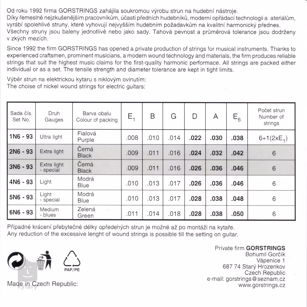 Die Saiten für E-Gitarren des tschechischen Herstellers Gorstrings bieten einen klaren, frequenzausgeglichenen Klang, der das wahre Potenzial Ihrer Gitarre zur Geltung bringt. Ihre Basis bildet ein rundes Stahlkern, der mit vernickeltem Stahl umwickelt ist – dies verleiht ihnen einen wärmeren, abgerundeten Charakter. Die Saiten werden aus erstklassigen Materialien hergestellt und von den besten tschechischen Handwerkern gefertigt. Gönnen Sie Ihrer Gitarre das Beste mit Gorstrings-Saiten!