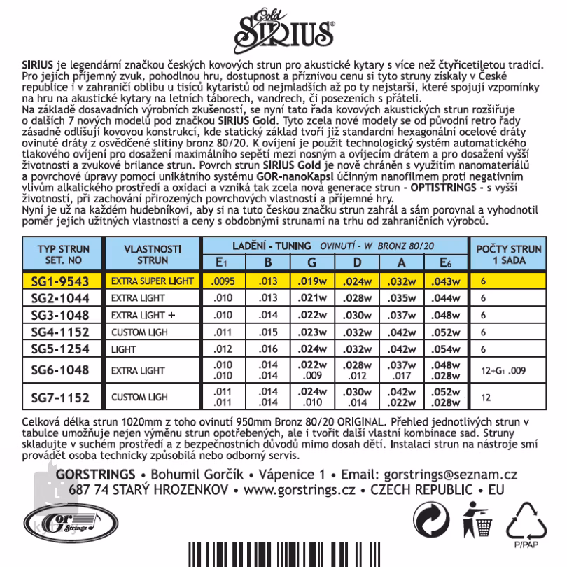 SIRIUS-Saiten haben eine lange Tradition auf dem tschechischen Markt und sind vor allem bei Tramps und Folkspielern sehr beliebt. Ihre große Anziehungskraft liegt nicht nur in ihrem günstigen Preis, sondern auch in ihrem angenehmen Klang und komfortablen Spiel. Die neue Sirius Gold Serie unterscheidet sich jedoch in mehreren Punkten von der ursprünglichen Sirius. Die Saiten haben einen sechseckigen Kern, der mit der beliebten Bronzelegierung (80/20) umsponnen ist, was ihnen einen hellen, klingenden Klang verleiht, der an jedem Lagerfeuer auffällt. Außerdem sind sie mit einer speziellen Anti-Korrosions-Beschichtung versehen, die ihre Lebensdauer erheblich verlängert. Das Ergebnis ist eine völlig neue Generation von Optistrings, die sich durch einen brillanten, warmen Klang, hohe Haltbarkeit und extrem lange Lebensdauer auszeichnet.