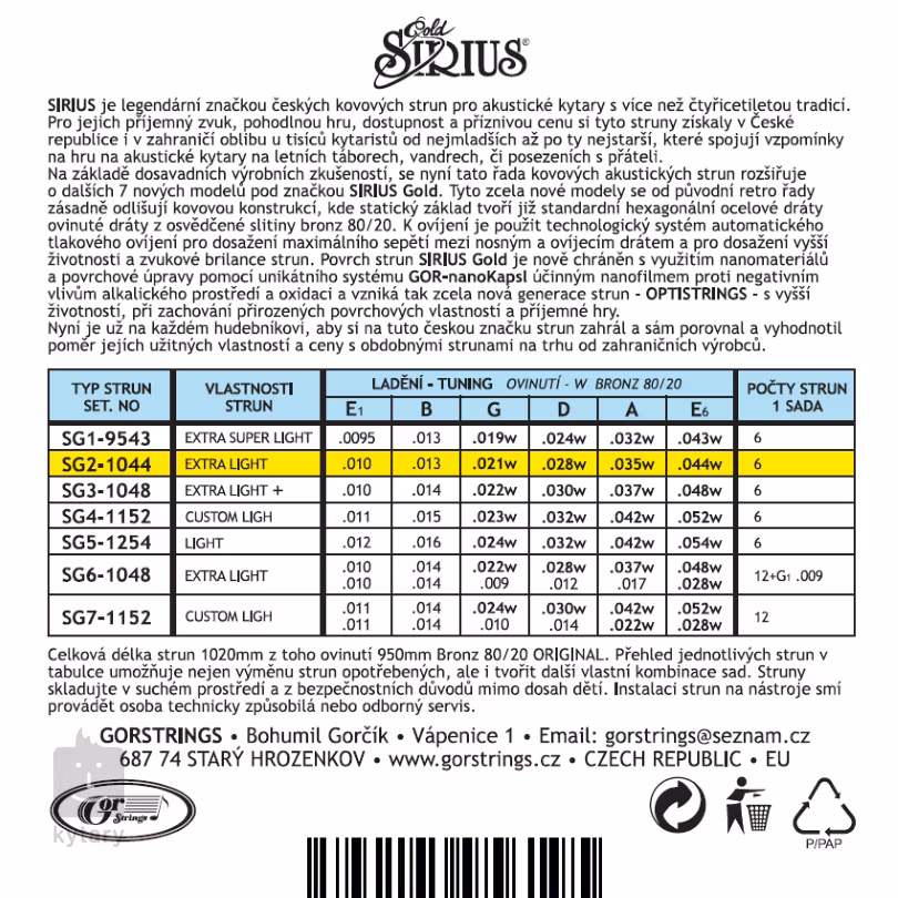 SIRIUS-Saiten haben eine lange Tradition auf dem tschechischen Markt und sind vor allem bei Tramps und Folkspielern sehr beliebt. Ihre große Anziehungskraft liegt nicht nur in ihrem günstigen Preis, sondern auch in ihrem angenehmen Klang und komfortablen Spiel. Die neue Sirius Gold Serie unterscheidet sich jedoch in mehreren Punkten von der ursprünglichen Sirius. Die Saiten haben einen sechseckigen Kern, der mit der beliebten Bronzelegierung (80/20) umsponnen ist, was ihnen einen hellen, klingenden Klang verleiht, der an jedem Lagerfeuer auffällt. Außerdem sind sie mit einer speziellen Anti-Korrosions-Beschichtung versehen, die ihre Lebensdauer erheblich verlängert. Das Ergebnis ist eine völlig neue Generation von Optistrings, die sich durch einen brillanten, warmen Klang, hohe Haltbarkeit und extrem lange Lebensdauer auszeichnet.