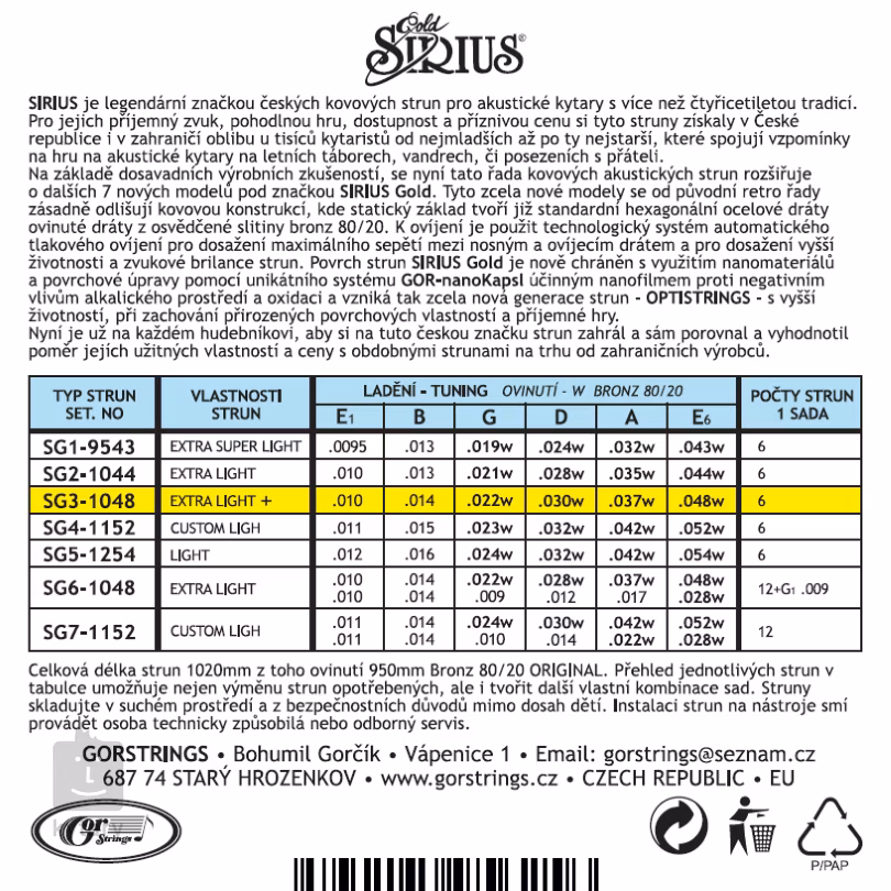 SIRIUS-Saiten haben auf dem tschechischen Markt eine lange Tradition und sind vor allem bei Wanderern und Folkmusikern sehr beliebt. Ihr großer Reiz liegt nicht nur im günstigen Preis, sondern auch im angenehmen Klang und dem komfortablen Spielgefühl. Diese neue Sirius-Gold-Serie unterscheidet sich jedoch in einigen Punkten von den ursprünglichen Sirius-Saiten. Die Saiten haben einen sechseckigen Kern, der mit einer beliebten Bronzelegierung (80/20) umwickelt ist, wodurch sie einen klaren, klangvollen Klang haben, der bei jedem Lagerfeuer zur Geltung kommt. Außerdem sind sie mit einer speziellen Korrosionsschutzbeschichtung versehen, die ihre Lebensdauer erheblich verlängert. Das Ergebnis ist eine völlig neue Generation von Optistrings-Saiten, die sich durch einen brillanten, warmen Klang, hohe Widerstandsfähigkeit und extrem lange Haltbarkeit auszeichnet.