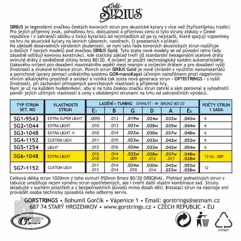 SIRIUS-Saiten haben eine lange Tradition auf dem tschechischen Markt und sind vor allem bei Tramps und Folkspielern sehr beliebt. Ihre große Anziehungskraft liegt nicht nur in ihrem günstigen Preis, sondern auch in ihrem angenehmen Klang und komfortablen Spiel. Die neue Sirius Gold Serie unterscheidet sich jedoch in mehreren Punkten von der ursprünglichen Sirius. Die Saiten haben einen sechseckigen Kern, der mit der beliebten Bronzelegierung (80/20) umsponnen ist, was ihnen einen hellen, klingenden Klang verleiht, der an jedem Lagerfeuer auffällt. Außerdem sind sie mit einer speziellen Anti-Korrosions-Beschichtung versehen, die ihre Lebensdauer erheblich verlängert. Das Ergebnis ist eine völlig neue Generation von Optistrings, die sich durch einen brillanten, warmen Klang, hohe Haltbarkeit und extrem lange Lebensdauer auszeichnet.
