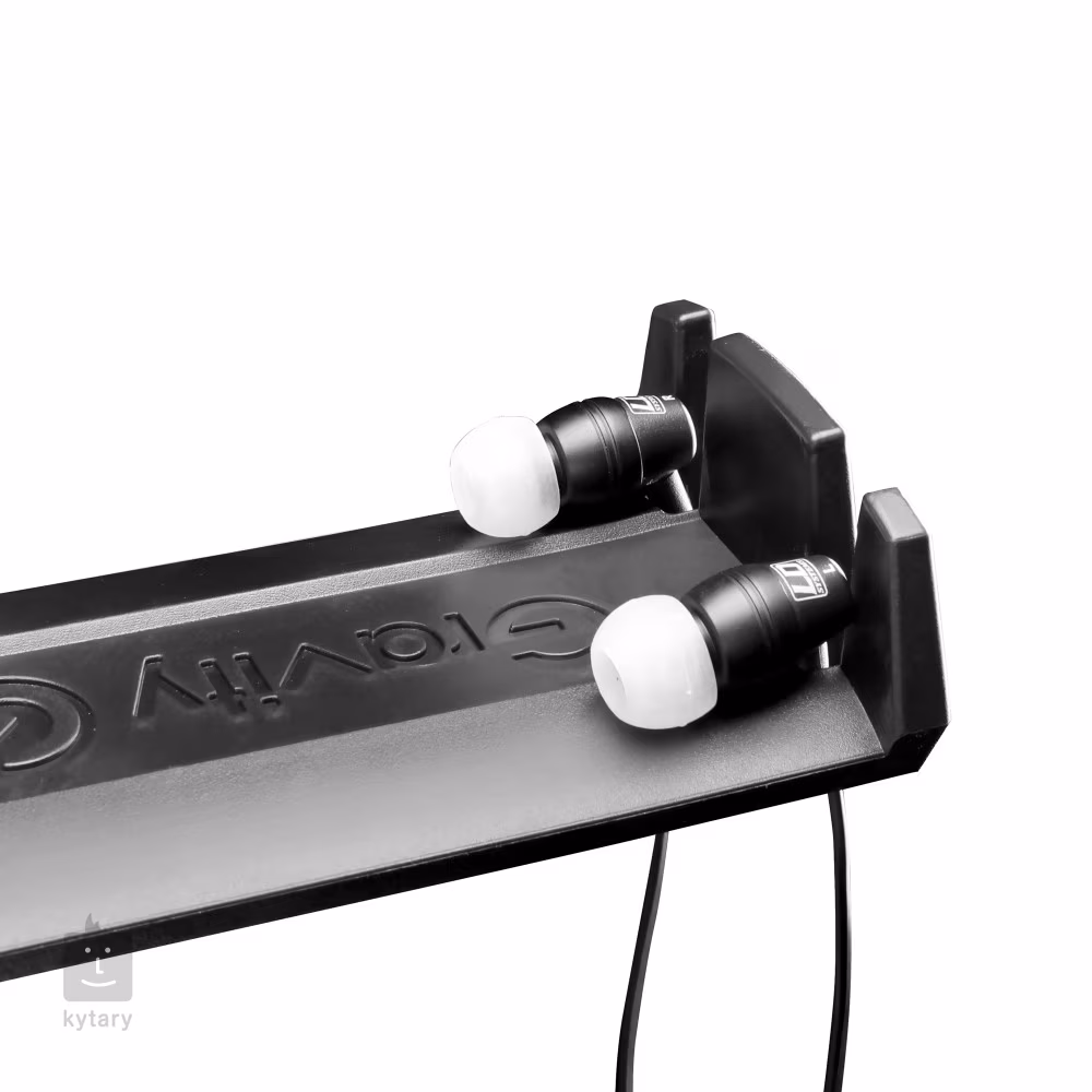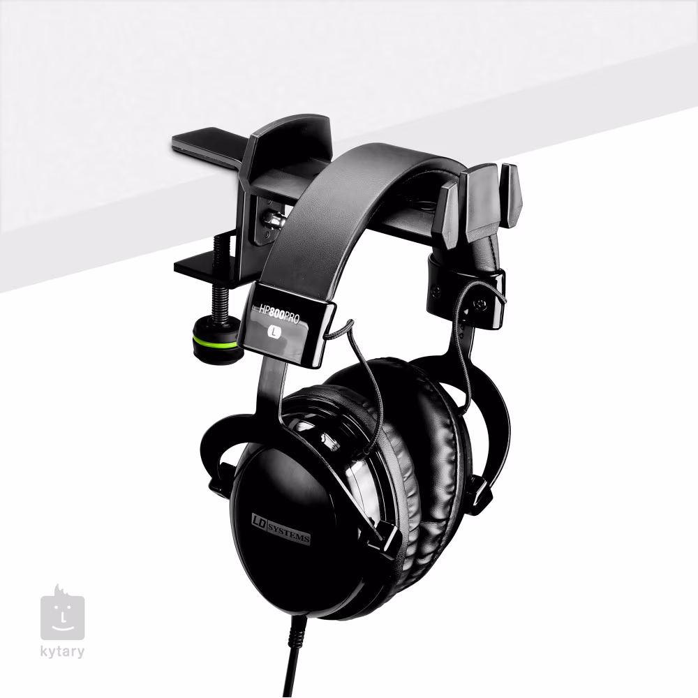 Studio-Kopfhörerhalter mit Gewindeschraube, geeignet für Heim- und professionelle Aufnahmestudios oder Rundfunkstudios. Der Halter lässt sich an einer Tischplatte mit einem Durchmesser von 5 bis 45 mm befestigen und verfügt über spezielle Rillen für In-Ear-Kopfhörer und eine perfekte Kabelführung.