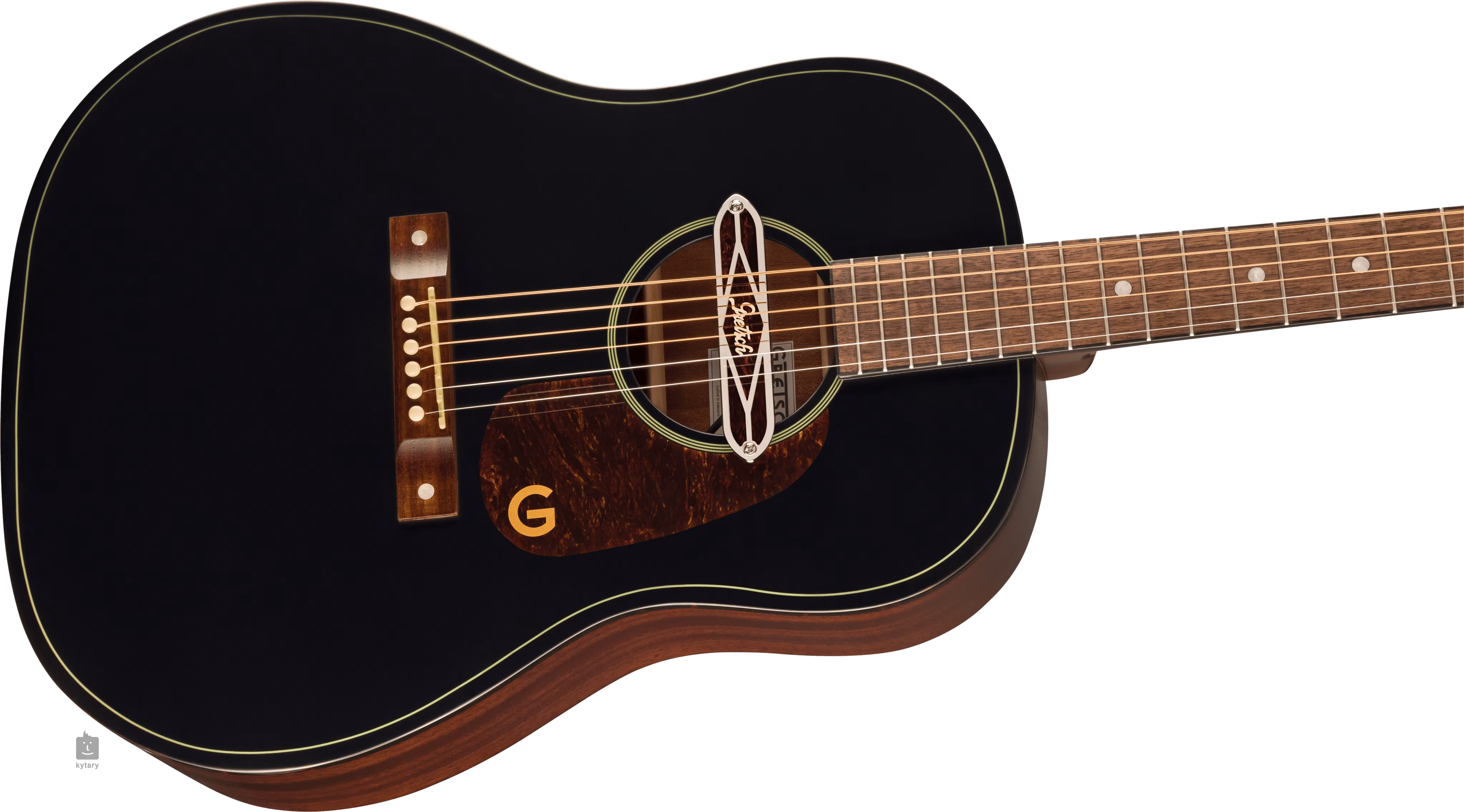 Ein Gretsch Deltoluxe Magnet-Tonabnehmer im Schallloch bietet die Möglichkeit der Klangverstärkung. Die Saiten werden über einen Nullbund und einen kompensierten Sattel aus synthetischem Knochen in offener Druckgussmechanik und einem Walnuss-Griffbrett befestigt. Der stilvolle Look der Gitarre wird durch ein Black Top-Finish auf der Decke, ein einlagiges Schlagbrett und eine Schildpattimitation am Rand sowie Nickel-Hardware unterstrichen.