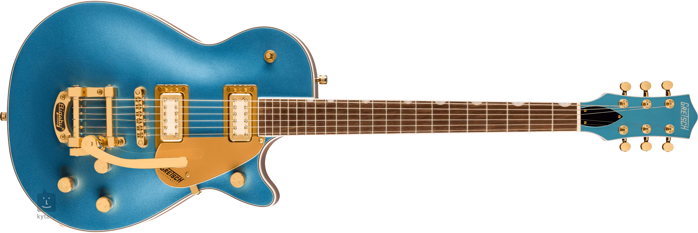 Die Saiten werden in den Druckguss-Stimmmechaniken des Unternehmens und durch den Adjusto-Matic-Saitenhalter im Bigsby B70-Tremolo montiert. Das stilvolle Design des Instruments wird durch das umlaufende Binding des Korpus mit schwarzen und weißen Linien, die goldene Hardware und das goldene Plexi-Pickguard mit schwarzem Gretsch-Logo unterstrichen.