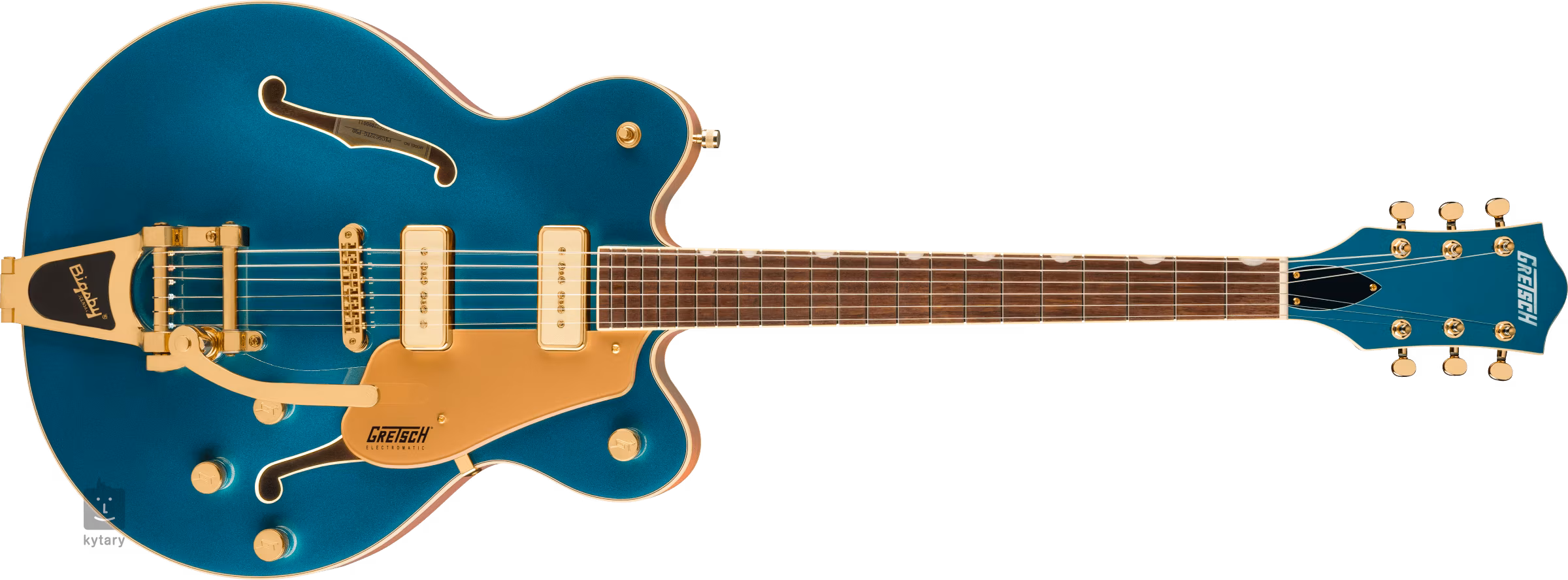 Die Saiten werden in Druckguss-Stimmmechaniken und über den Adjusto-Matic-Saitenhalter in einem lizenzierten Bigsby B70-Tremolo montiert. Das klassische, ansprechende Design der Gretsch-Gitarren wird durch eine Reihe stilvoller Merkmale unterstrichen - von der eleganten Griffbretteinfassung mit schwarzen und weißen Linien bis hin zur goldenen Hardware und dem Gold-Plexi-Pickguard.