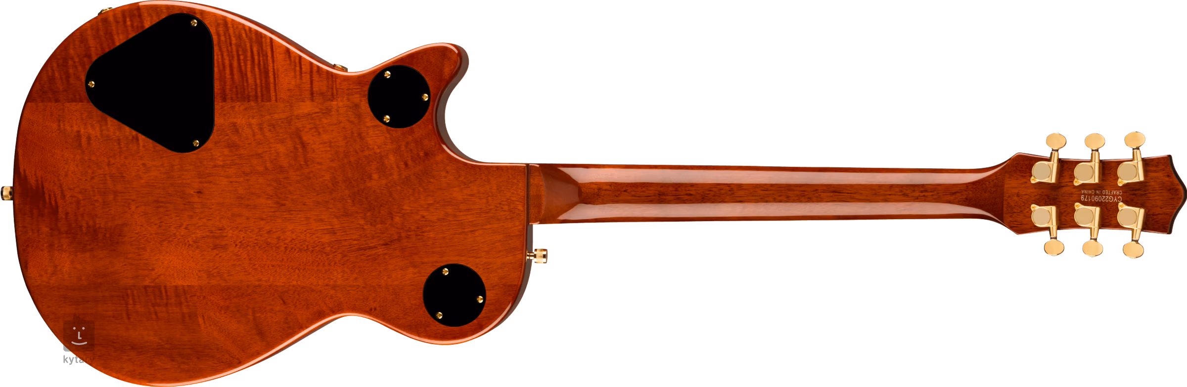 Die Saiten werden in den Druckguss-Stimmmechaniken des Unternehmens und durch den Adjusto-Matic-Saitenhalter im Bigsby B70-Tremolo montiert. Das stilvolle Design des Instruments wird durch das umlaufende Binding des Korpus mit schwarzen und weißen Linien, die goldene Hardware und das goldene Plexi-Pickguard mit schwarzem Gretsch-Logo unterstrichen.