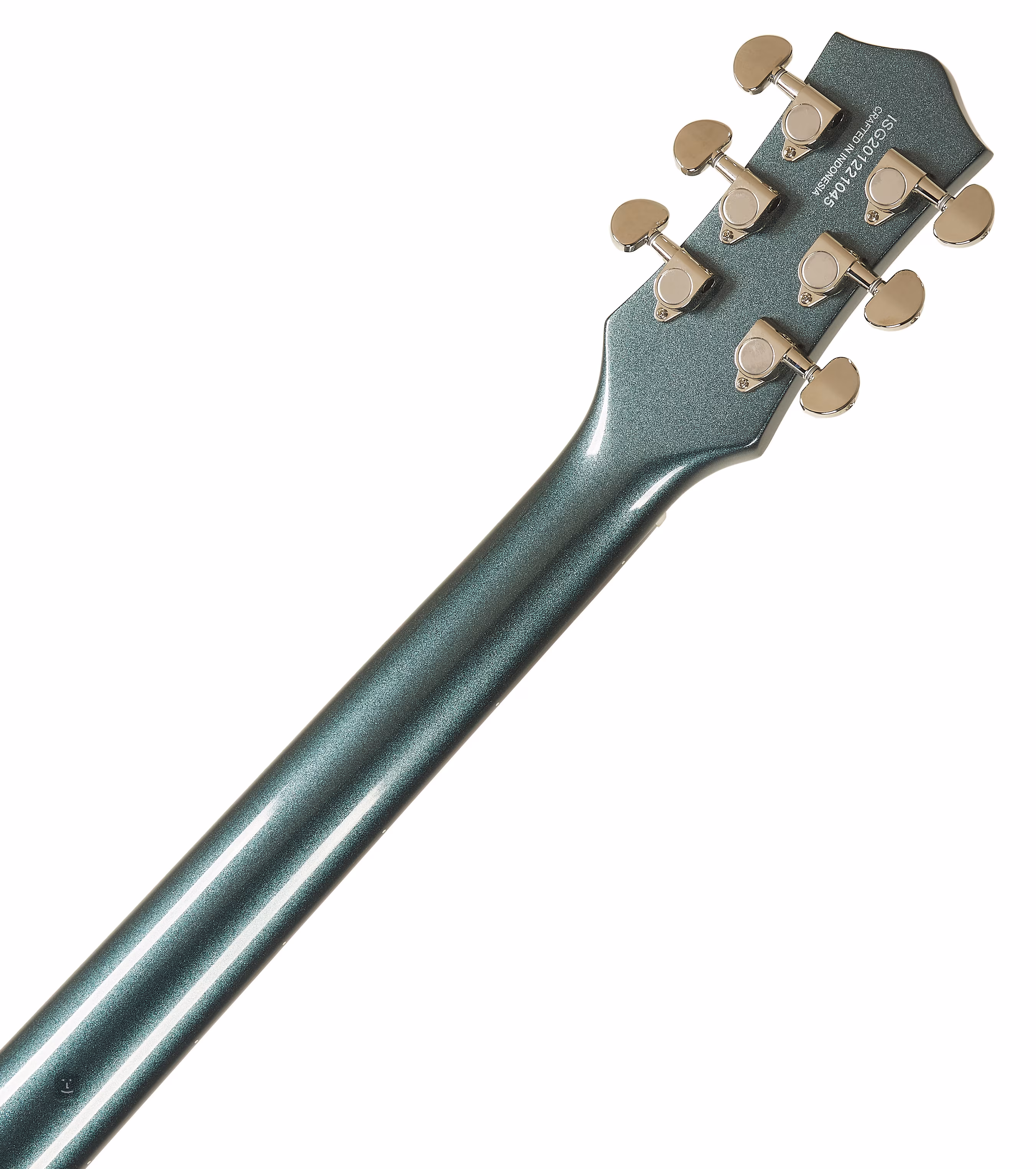 Das G2210 basiert auf einem einteiligen Design. Der Korpus des Instruments ist aus Nato-Holz gefertigt. Der verschraubte Hals mit Thin-U-Profil ist mit einem Feigenholz-Griffbrett mit zweiundzwanzig Medium-Jumbo-Bünden verleimt. Die Orientierung auf der Oberfläche wird durch versetzte Positionsmarkierungen aus Perlmuttimitat (Neo-Classic Thumbnail) erleichtert.
