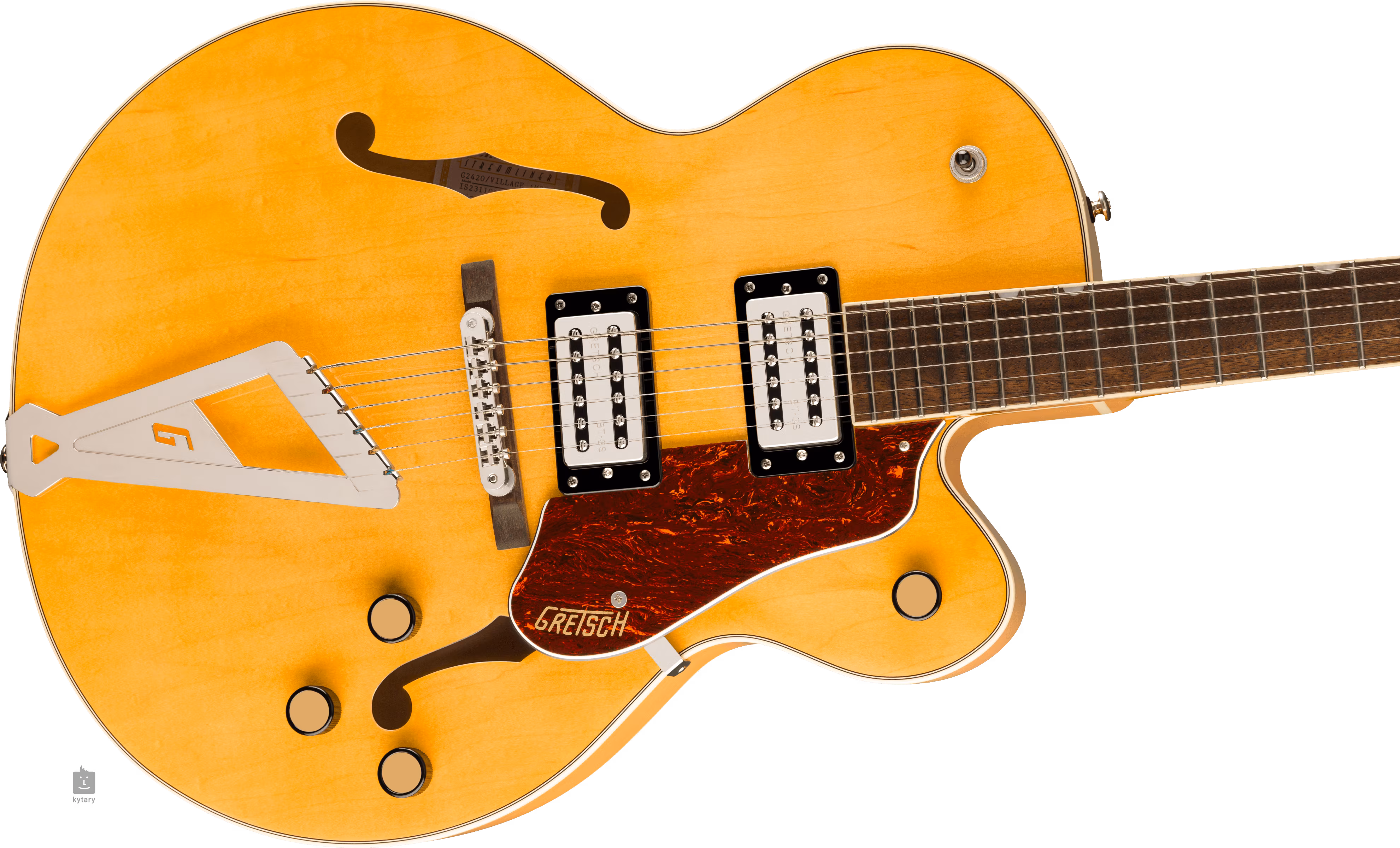 Der Korpus der G2420 Streamliner Hollow Body Single-Cut Village Amber ist aus laminiertem Ahorn gefertigt. Der Nato-Hals mit "Soft C"-Profil ist auf ein Feigengriffbrett mit zweiundzwanzig Medium-Jumbo-Bünden geleimt. Die Orientierung auf seiner Oberfläche wird durch versetzte Positionsmarker aus Perlmuttimitat (Pearloid Neo-Classic Thumbnail) erleichtert.