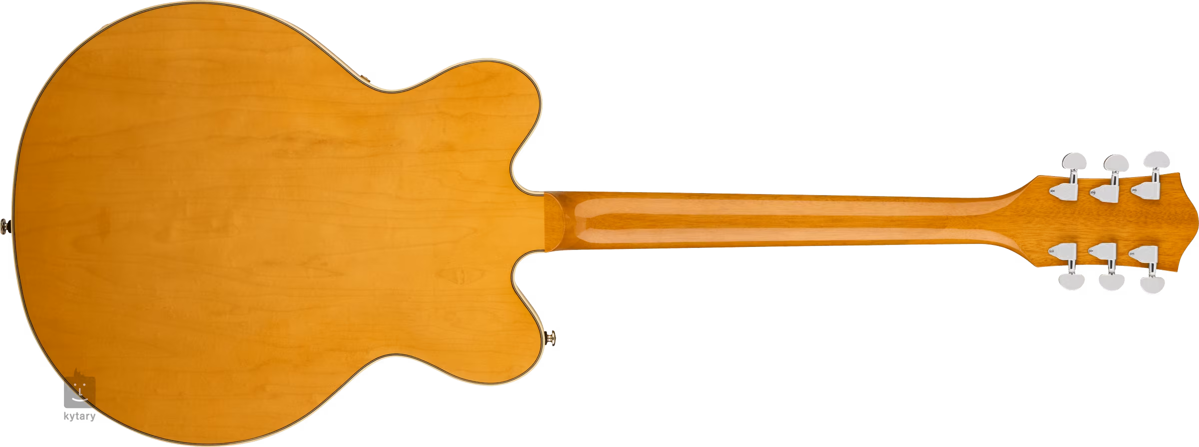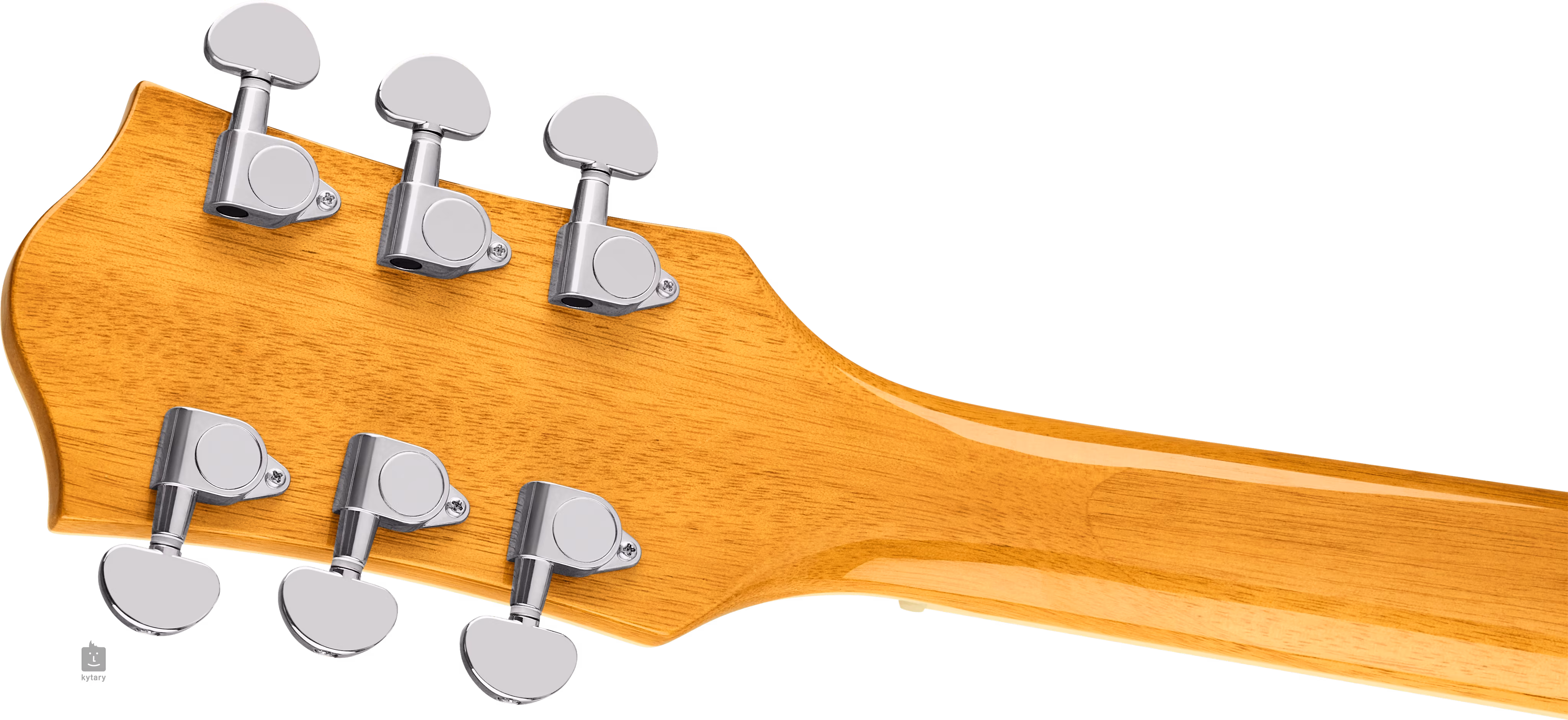 Die Saiten werden über einen Knochen-Nullbund in den Druckguss-Stimmmechaniken des Unternehmens und über ein Adjusto-Matic-Tailpiece in einem lizenzierten Bigsby B70-Tremolo verankert. Das klassische, augenfreundliche Design der Gretsch-Gitarren wird durch eine Reihe stilvoller Merkmale unterstrichen - von der gewölbten Korpuskonstruktion mit F-Löchern, dem eleganten Binding mit dezenter Patina (Aged White), Nickel-Hardware bis hin zum dreilagigen Schlagbrett aus Schildpatt-Imitat mit goldenem Gretsch-Logo.
