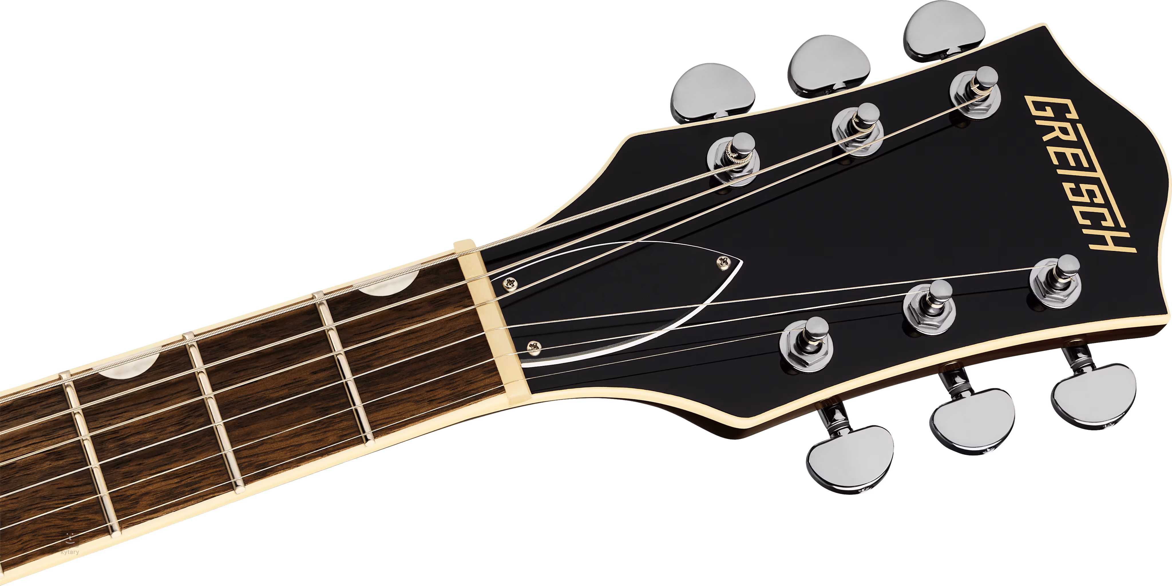 Die Saiten werden über einen Knochenbund in den Druckguss-Stimmmechaniken des Unternehmens und über ein Adjusto-Matic-Saitenhalter in einem V-Stoptail-Saitenhalter verankert. Das klassische, augenfreundliche Design der Gretsch-Gitarren wird durch eine Reihe stilvoller Merkmale unterstrichen - von der gewölbten Korpuskonstruktion mit F-Löchern, dem eleganten Binding mit dezenter Patina (Aged White), Nickel-Hardware bis zum einlagigen Schlagbrett mit goldenem Gretsch-Logo.