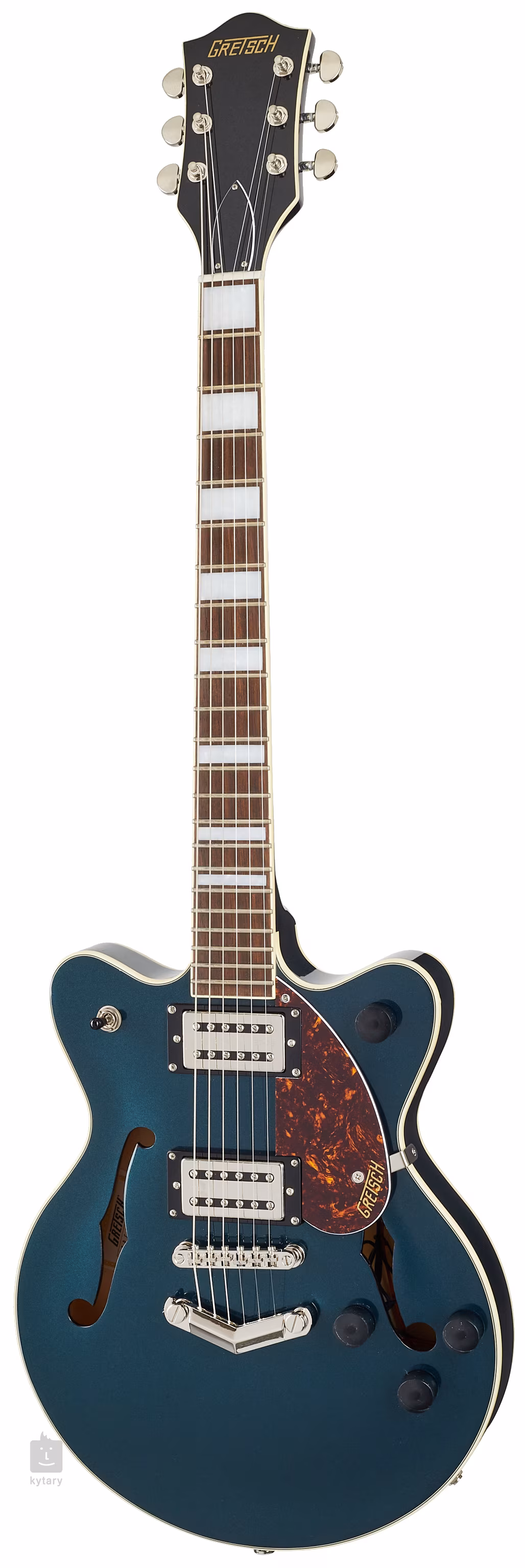 Die präzise Stimmung wird zum einen durch die Befestigung der Saiten über den Nullbund aus Kunstknochen in den Die-Cast-Stimmmechaniken des Unternehmens gewährleistet, zum anderen durch den Adjusto-Matic-Saitenhalter und den V-Stoptail. Das klassische, ansprechende Design der Gretsch-Gitarren wird durch eine Reihe von Styling-Merkmalen akzentuiert - von der gewölbten Korpuskonstruktion mit ausgestellten F-Löchern für eine bessere akustische Projektion, elegantem Binding mit einem subtilen Hauch von Patina (Aged White), schwarz-weißem Schlagbrett, Nickel-Hardware bis hin zum dreilagigen Schlagbrett aus Schildpatt-Imitat mit goldenem Gretsch-Logo.
