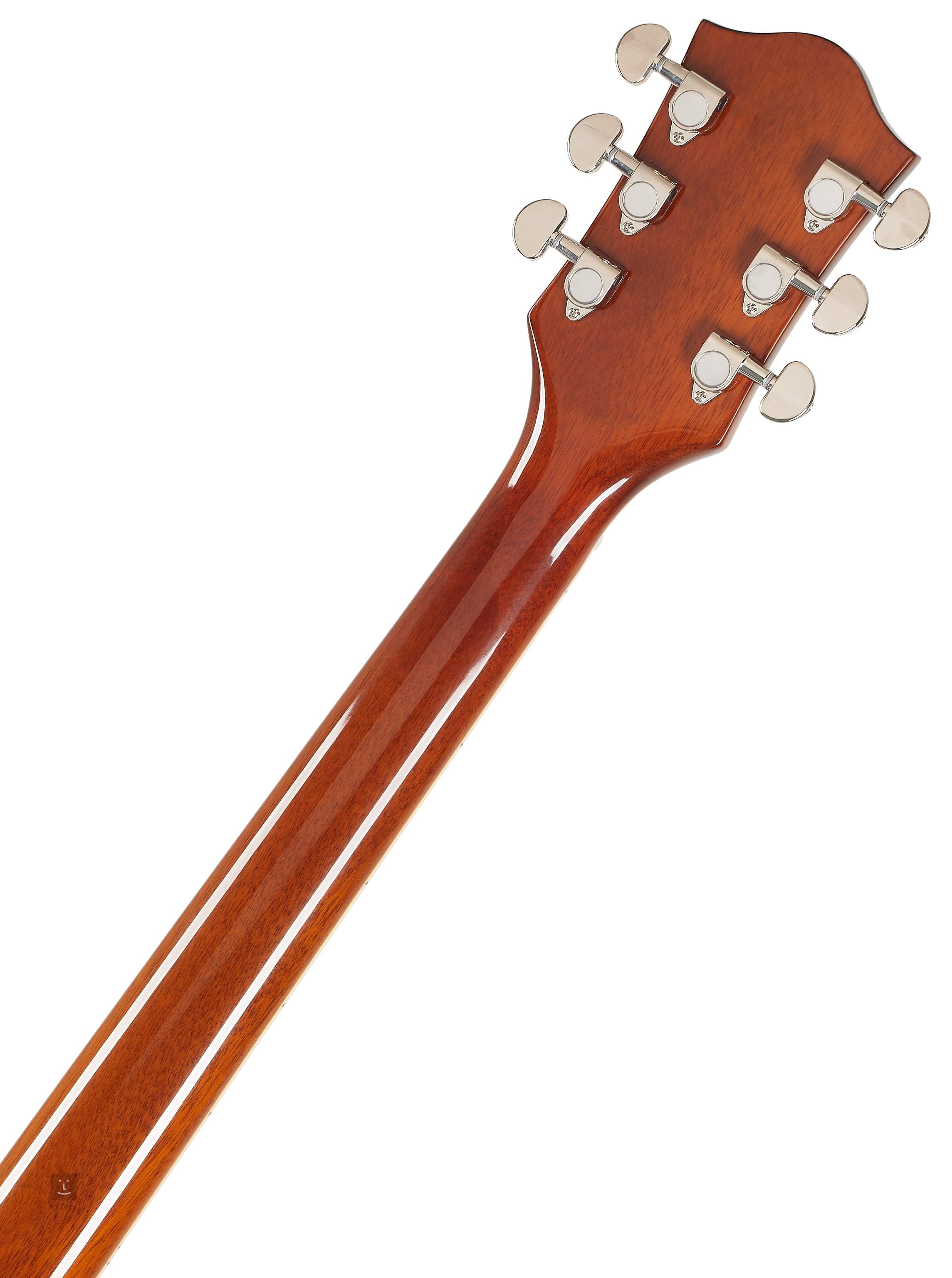 Die präzise Stimmung wird durch die Befestigung der Saiten über den künstlichen Knochen-Nullbund in den Die-Cast-Stimmmechaniken und der Adjusto-Matic-Kopfplatte des Unternehmens gewährleistet. Ein lizenziertes Bigsby B50 Tremolo verleiht Ihrem Spiel subtile Klangeffekte. Das klassische, ansprechende Design der Gretsch-Gitarren wird durch eine Reihe von Styling-Merkmalen akzentuiert - von ausgestellten F-Löchern für eine bessere akustische Projektion, stilisierten Pickup-Einfassungen, elegantem Binding mit einem subtilen Hauch von Patina (Aged White), ergänzt durch schwarze und weiße Linien, Nickel-Hardware, einem einlagigen Schlagbrett aus Schildpatt-Imitat und einem beeindruckenden Finish.