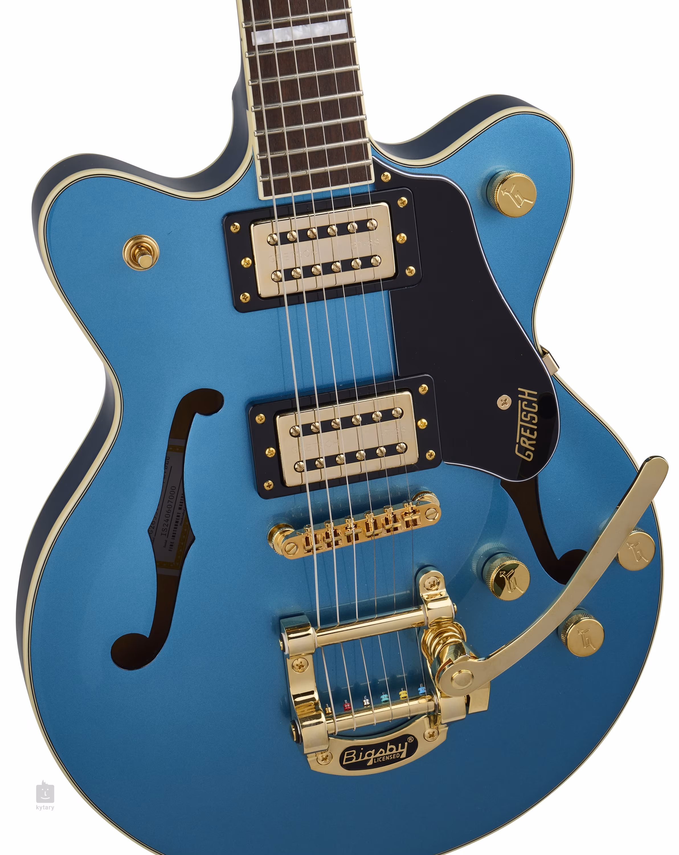 Die Saiten werden über einen Knochen-Nullbund in den Druckguss-Mechaniken des Unternehmens und über einen Adjusto-Matic-Kolben in einem lizenzierten Bigsby B50-Tremolo verankert. Das klassische, ansprechende Design der Gretsch-Gitarren wird durch eine Reihe stilvoller Merkmale unterstrichen - von der gewölbten F-Loch-Korpuskonstruktion, dem eleganten Perimeter-Binding, dem schwarzen Schlagbrett und der goldfarbenen Hardware.