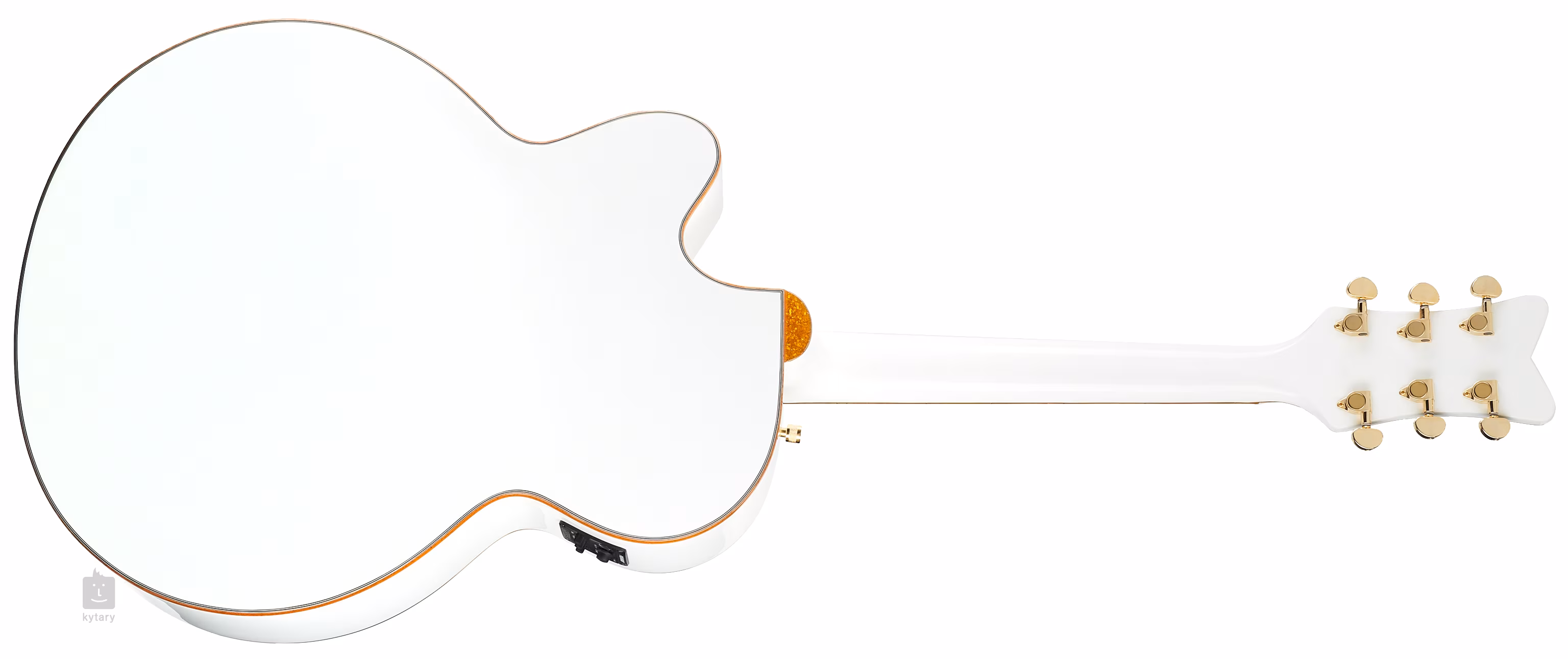 Der Mahagonihals ist auf ein Feigengriffbrett mit einundzwanzig Bünden geleimt. Ein Cutaway im unteren Bereich des Korpus erleichtert die höheren Lagen des Griffbretts. Die Saiten werden in Druckguss-Stimmmechaniken mit Goldlackierung über einem Griffbrett aus synthetischem Knochen mit kompensiertem Sattelbund und einem Feigenholz-Griffbrett gehalten. Die schöne Verarbeitung wird durch die Kopfplatte im Falcon-Stil mit Gretsch-Logo in Gold-Finish, die goldene Korpusumrandung und das Gold-Plexi-Schlagbrett mit Firmenlogo und Falken-Silhouette noch unterstrichen.