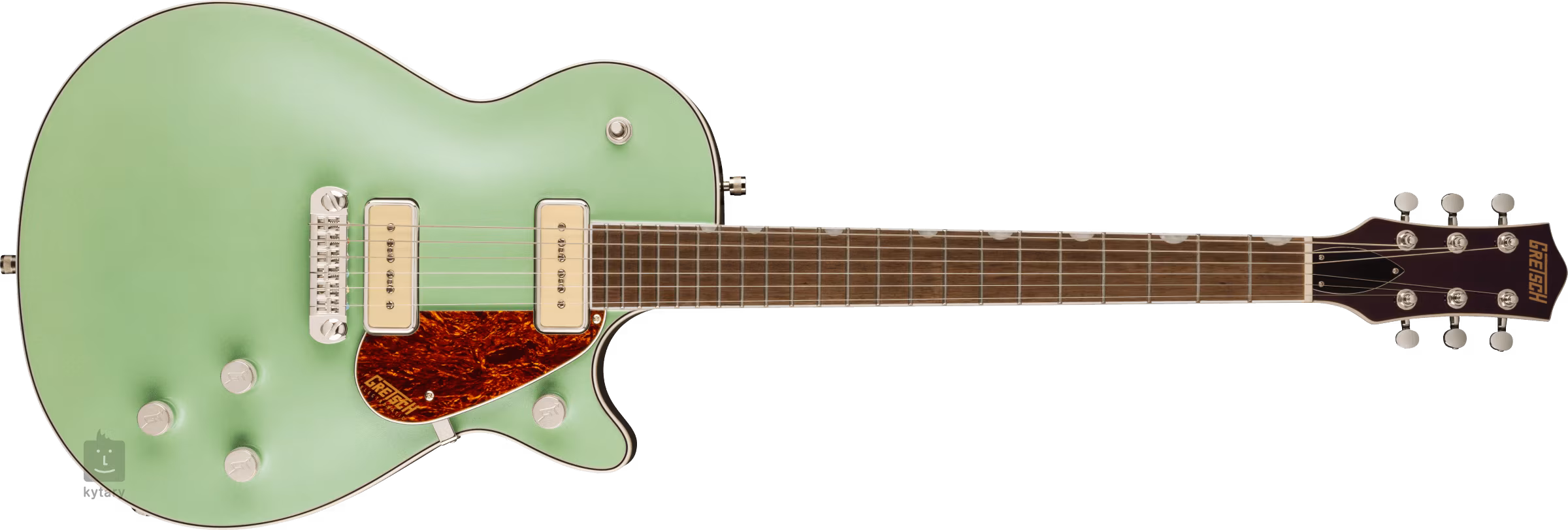 Die Saiten sind in den die-cast-Stimmmechaniken des Unternehmens und in einer festen Kopfplatte (Adjustable Wrap-Around) gelagert. Das stilvolle Design des Instruments wird durch traditionelle Elemente in Form einer hellen Korpusumrandung akzentuiert, die durch schwarze und weiße Linien, Nickel-Hardware und ein Schlagbrett aus Schildpatt-Imitat mit dem Gretsch-Logo in Gold ergänzt wird.