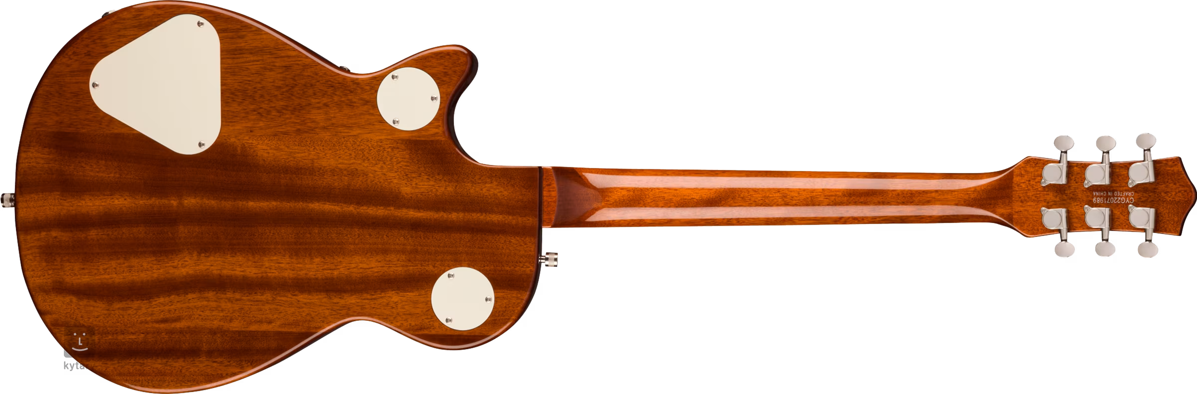 Die Saiten werden in die die-cast-Stimmmechaniken des Unternehmens eingespannt und über den Adjusto-Matic-Saitenhalter in ein Bigsby-Tremolo. Das stilvolle Design des Instruments wird durch traditionelle Elemente in Form einer hellen Korpusumrandung akzentuiert, die durch schwarze und weiße Linien, Nickel-Hardware und ein Schlagbrett aus Schildpatt-Imitat mit dem Gretsch-Logo in Gold ergänzt wird.