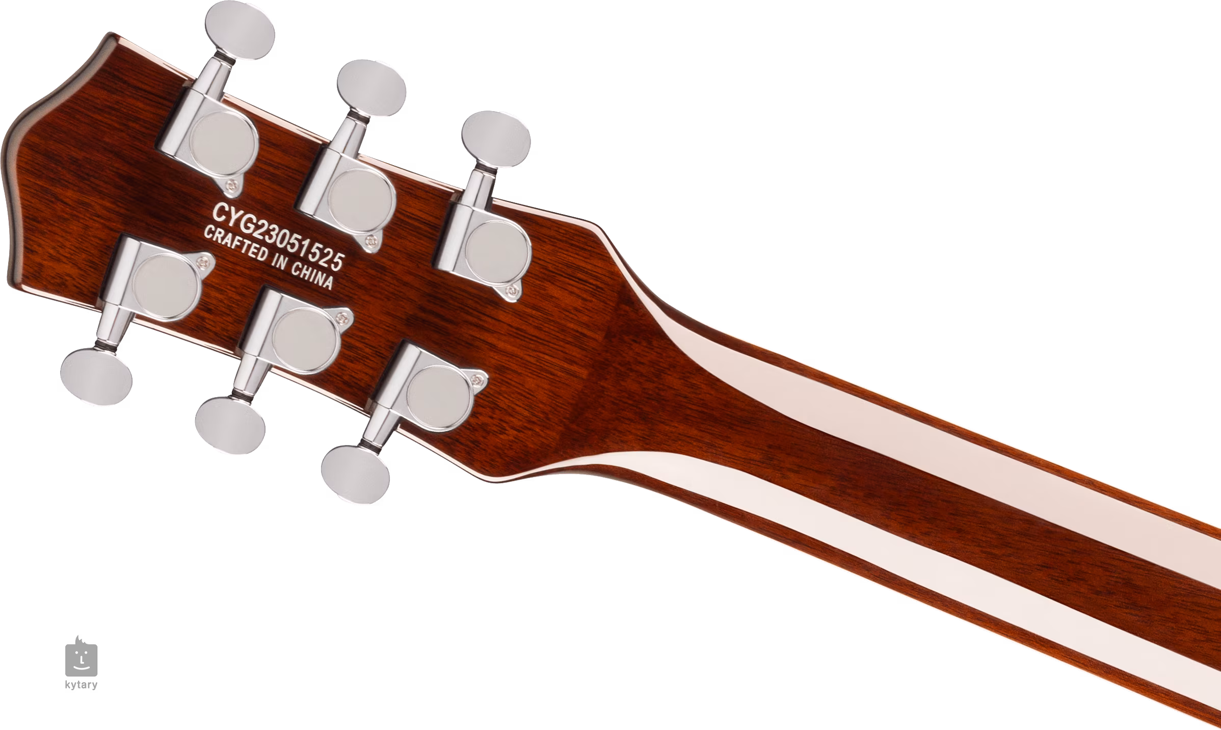 Die Verankerung der Saiten erfolgt über ein Griffbrett aus synthetischem Knochen in den hauseigenen Druckguss-Laufwerken und über einen Adjusto-Matic verstellbaren Saitenhalter in den Saitenreitern (V-Stoptai). Das stilvolle Design des Instruments wird durch die weiße Korpusverkleidung akzentuiert, die durch ein schwarz-weißes Schlagbrett, verchromte Hardware und ein schwarzes Plexi-Schlagbrett mit silbernem Gretsch-Logo ergänzt wird.