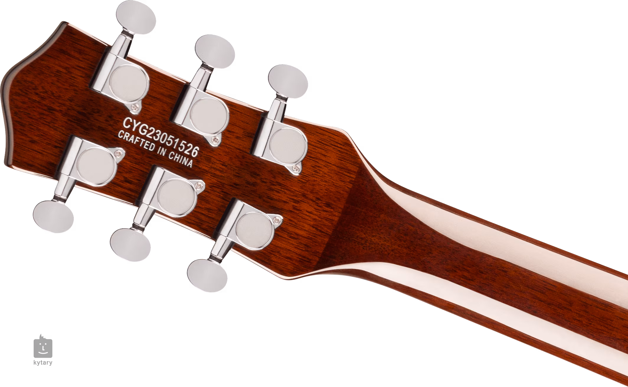 Die Verankerung der Saiten erfolgt über einen synthetischen Knochenbund in der hauseigenen Druckgussmechanik und über einen Adjusto-Matic einstellbaren Saitenhalter im V-Stop-Tail. Das stilvolle Design des Instruments wird durch das weiße Body Binding akzentuiert, das durch ein schwarz-weißes Schlagbrett, verchromte Hardware und ein Black Plexi Pickguard mit dem Gretsch-Logo in Gold ergänzt wird.