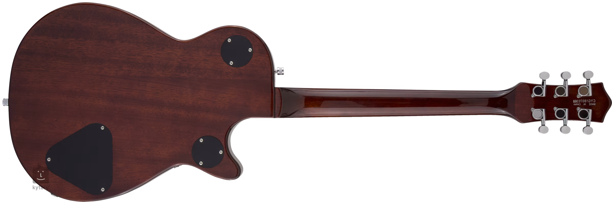 Das G5230T gehört zu der oben erwähnten Electromatic-Serie. Seine Form basiert auf dem beliebten LP-Konzept. Der Korpus der Gitarre besteht aus gekammertem Mahagoni und die Decke aus laminiertem Ahorn, die von einem weißen Binding mit schwarzer und weißer Zierleiste umgeben ist. Ein Griffbrett aus schwarzem Walnussholz mit zweiundzwanzig Medium-Jumbo-Bünden ist auf den Mahagoni-Hals mit einem Thin-U-Profil geklebt. Die Orientierung auf seiner Oberfläche wird durch versetzte Positionsmarkierungen aus Perlmuttimitat erleichtert (Neo-Classic Thumbnail).