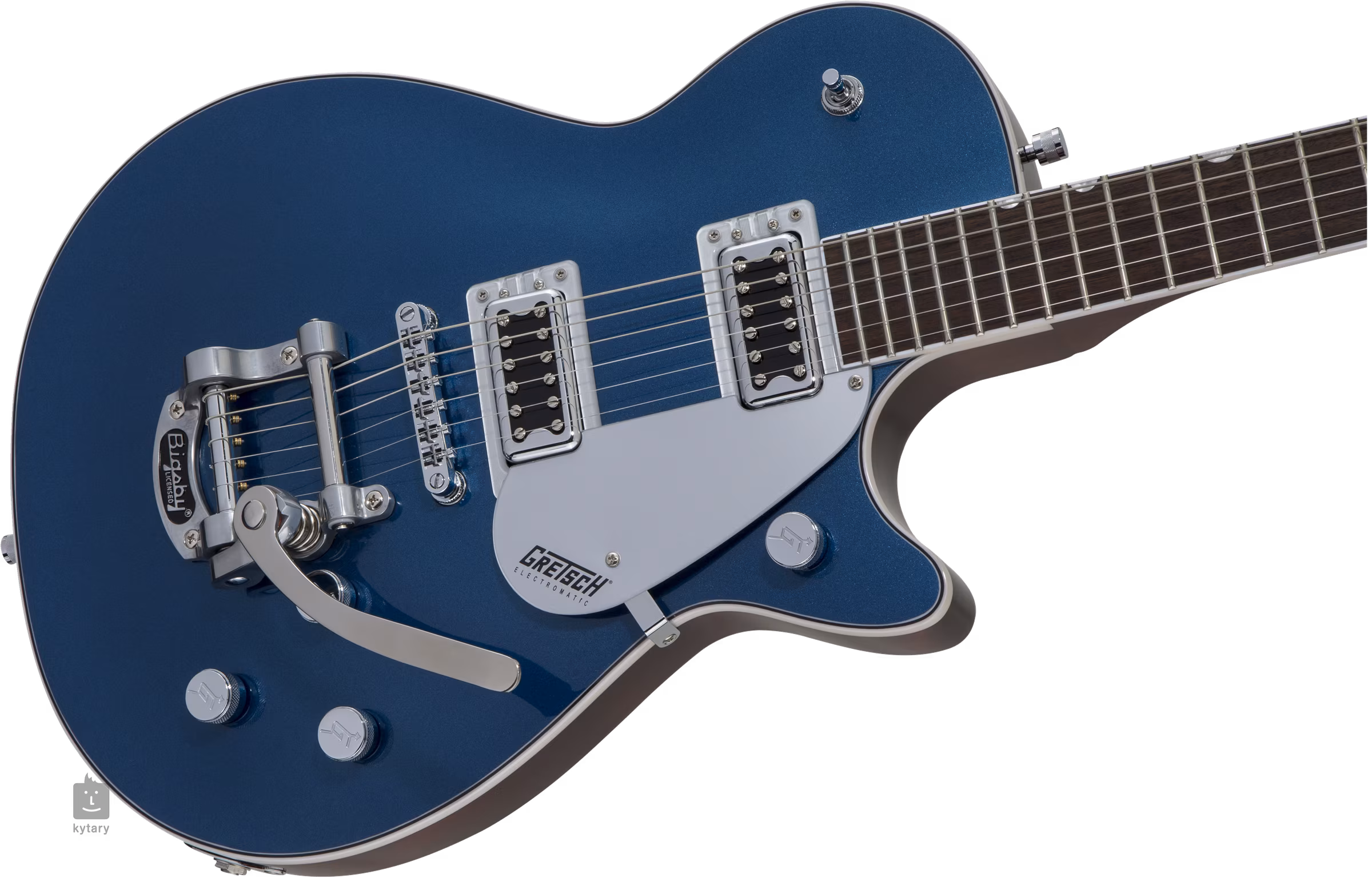 Die Saiten sind in den die-cast-eigenen Stimmmechaniken und dem Bigsby-Tremolo untergebracht. Das stilvolle Design des Instruments wird durch die Farbgebung in Aleutian Blue, die verchromte Hardware und das silberne Plexi-Pickguard mit schwarzem Gretsch-Firmenlogo passend ergänzt.
