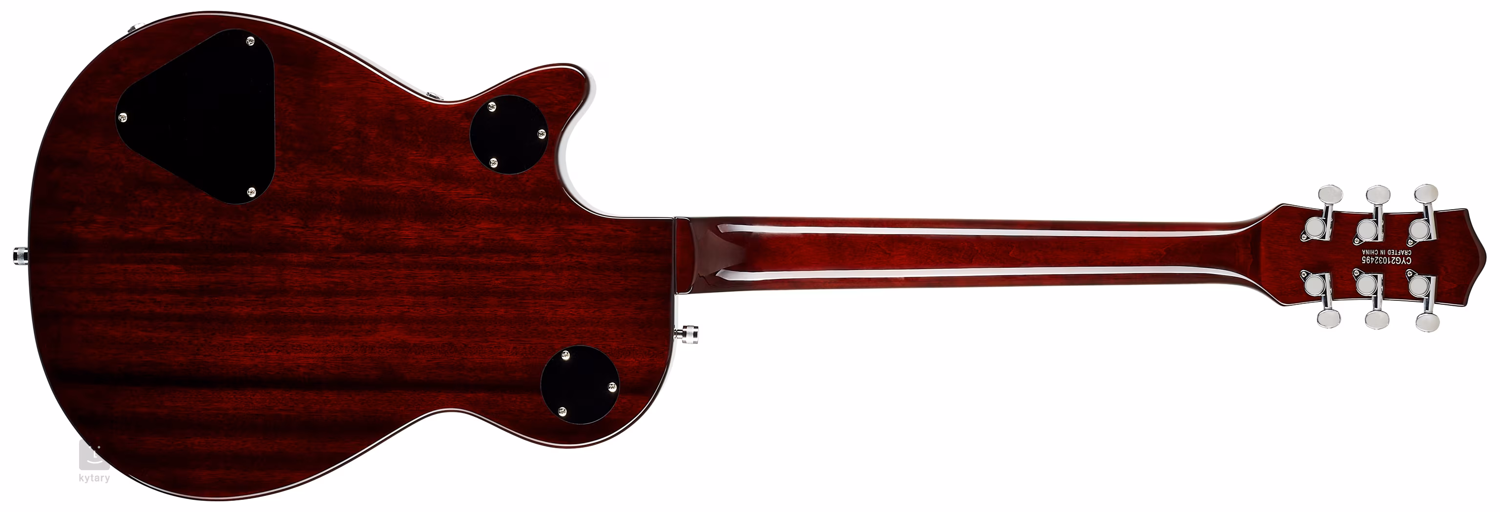 Das G5230T gehört zu der oben erwähnten Electromatic-Serie. Seine Form basiert auf dem beliebten LP-Konzept. Der Korpus der Gitarre besteht aus gekammertem Mahagoni und die Decke aus laminiertem Ahorn, die von einem weißen Binding mit schwarzer und weißer Zierleiste umgeben ist. Ein Griffbrett aus schwarzem Walnussholz mit zweiundzwanzig Medium-Jumbo-Bünden ist auf den Mahagoni-Hals mit einem Thin-U-Profil geklebt. Die Orientierung auf seiner Oberfläche wird durch versetzte Positionsmarkierungen aus Perlmuttimitat erleichtert (Neo-Classic Thumbnail).