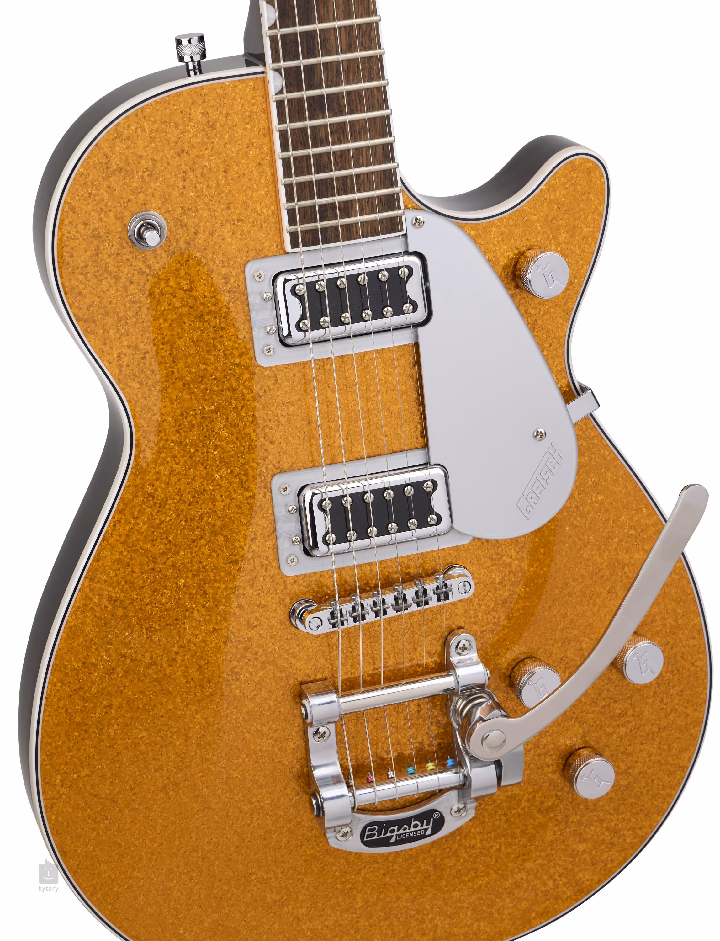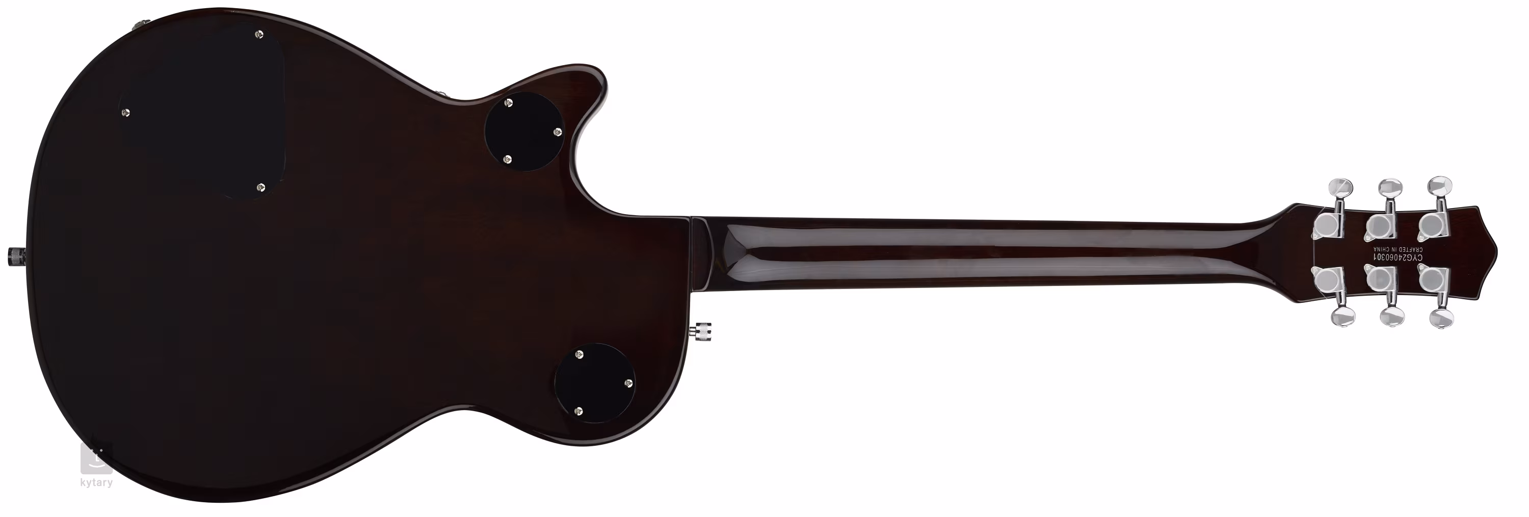 Die Saiten sind in der Druckgussmechanik des Unternehmens sowie in einer Adjusto-Matic-Kopfplatte und einem Bigsby B50-Tremolo montiert. Das stilvolle Design des Instruments wird durch verchromte Hardware und ein silbernes Plexi-Pickguard mit dem Gretsch-Firmenlogo in Silber akzentuiert.