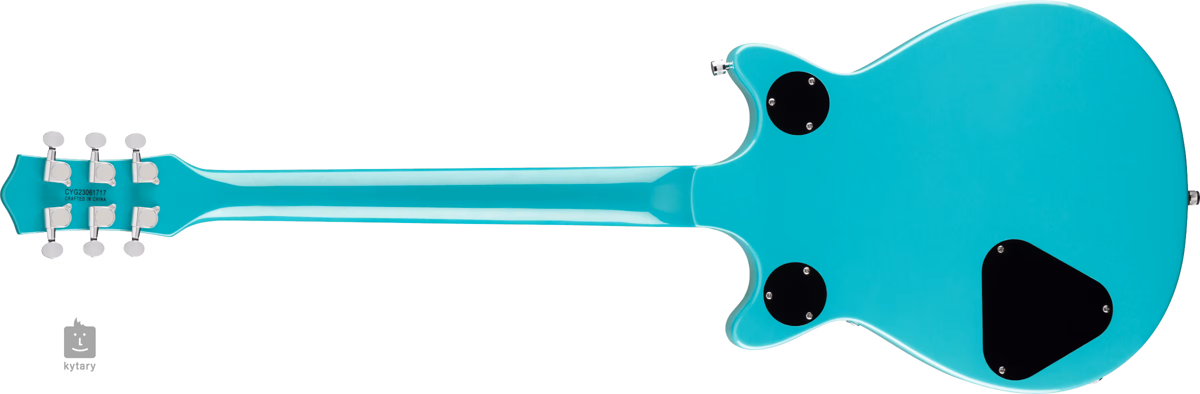 Der leichte, gekammerte Mahagonikorpus der Gitarre G5232T Electromatic Double Jet FT Caicos Green wird von einer gewölbten Ahorndecke bedeckt. Auf den Mahagoni-Hals mit dünnem U-Profil ist ein Feigengriffbrett mit zweiundzwanzig Medium-Jumbo-Bünden geklebt. Die Orientierung auf seiner Oberfläche wird durch versetzte Positionsmarkierungen aus Perlmuttimitat (Neo-Classic Thumbnail) erleichtert.
