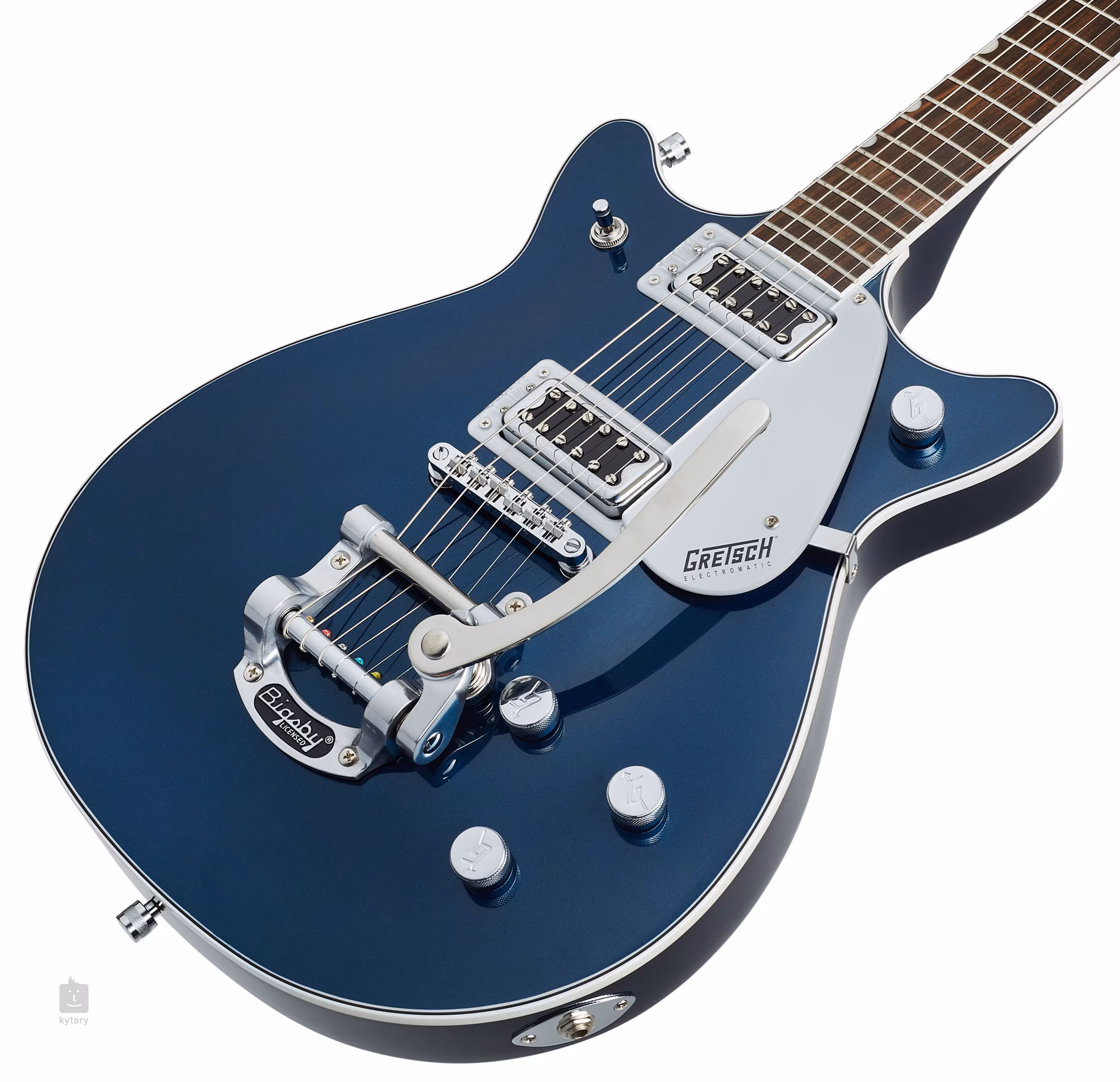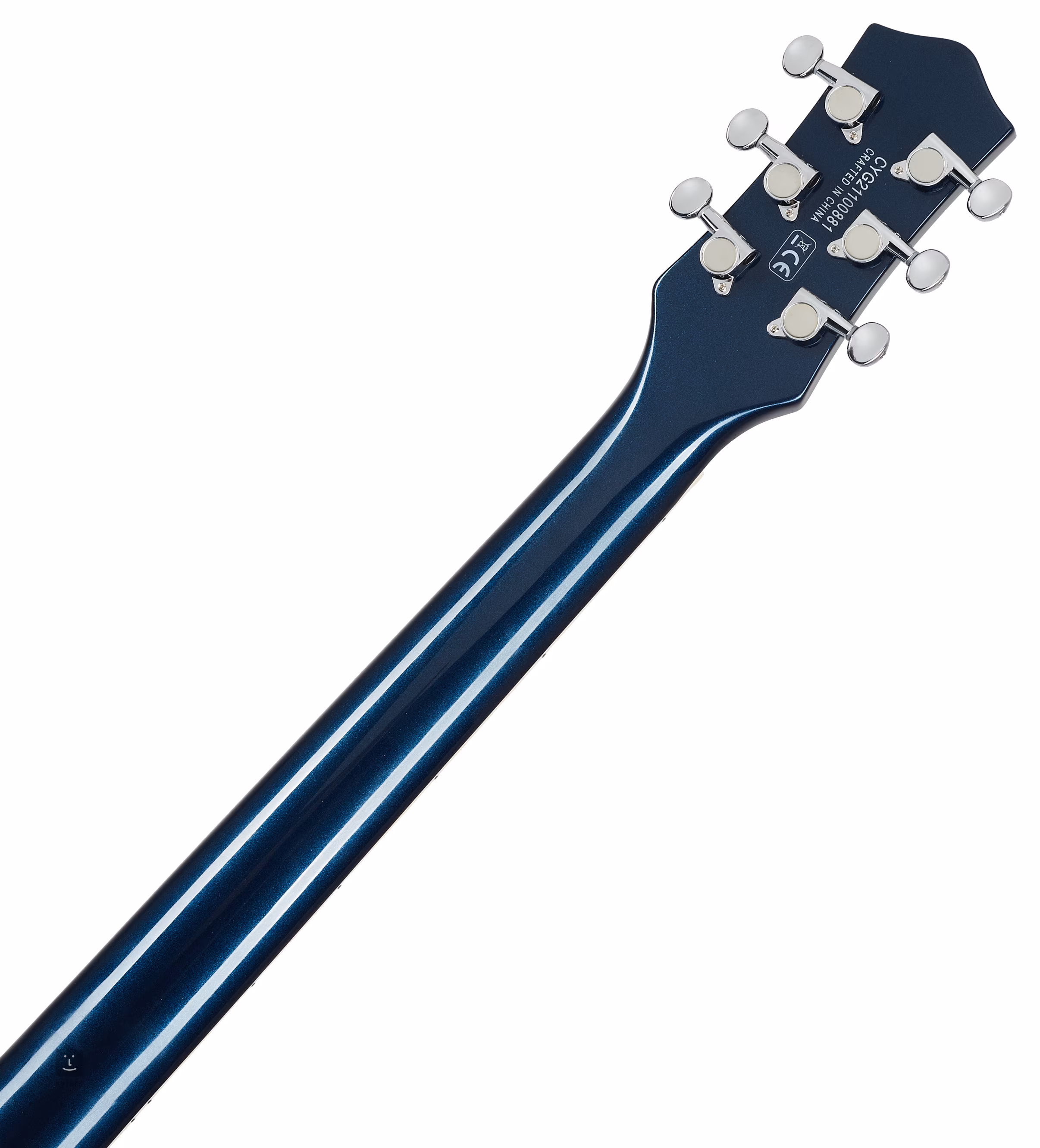 Die Saiten sind in den firmeneigenen Die-Cast-Stimmmechaniken und dem einstellbaren Adjusto-Matic-Saitenhalter mit einem lizenzierten Bigsby B50-Tremolo untergebracht. Das stilvolle Design des Instruments wird durch traditionelle Elemente in Form einer hellen Korpusumrandung akzentuiert, die durch schwarze und weiße Linien, verchromte Hardware und ein silbernes Plexi-Pickguard mit schwarzem Gretsch-Firmenlogo ergänzt wird.