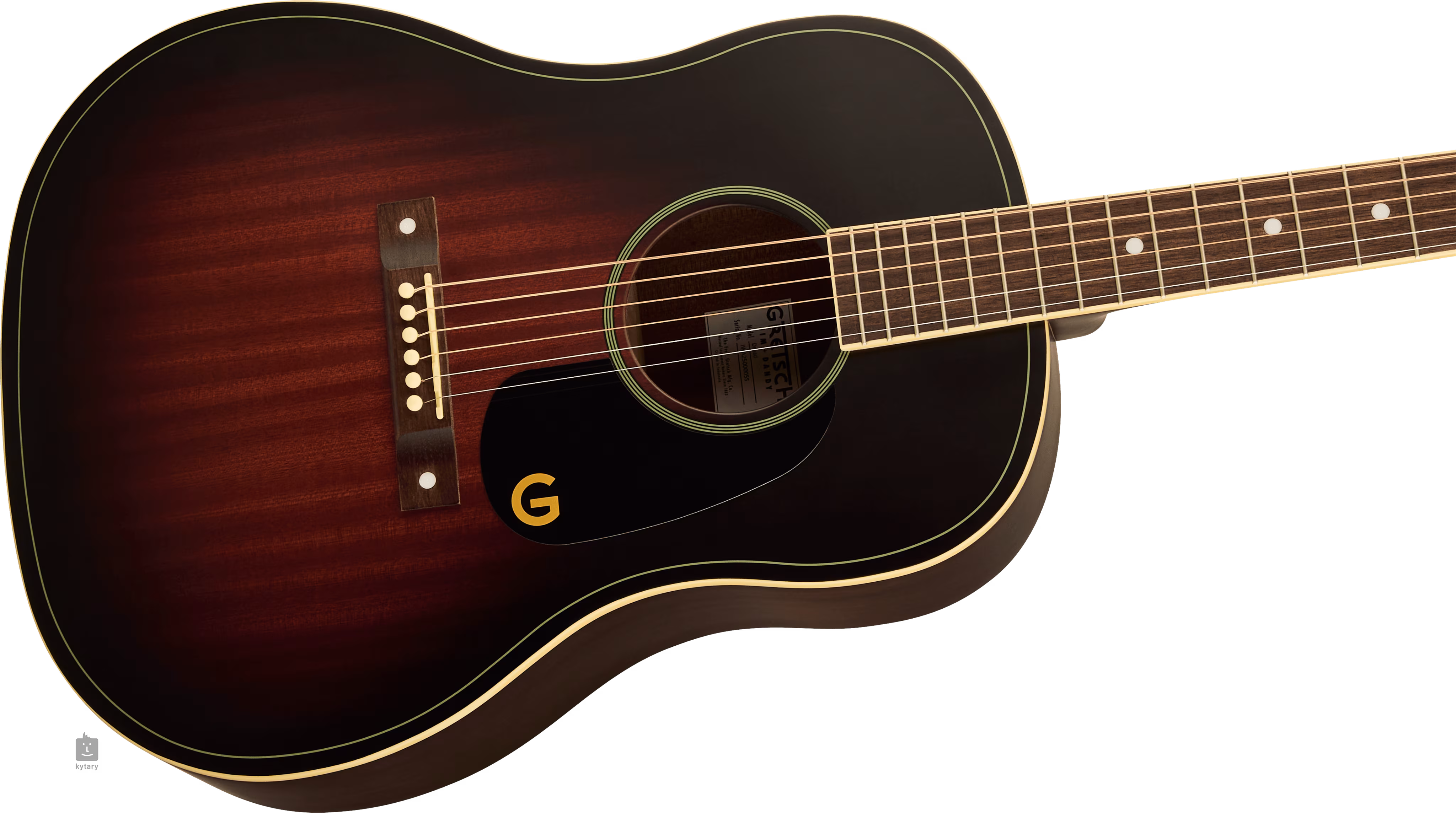 Der Korpus der Jim Dandy Dreadnought Deep Cherry Burst ist aus laminiertem Sapele gefertigt. Ein Walnuss-Griffbrett mit 20 Bünden ist auf einen Nato-Hals mit "C"-Profil geklebt. Die gute Resonanz des Korpus wird durch die traditionelle X-Riffelung unterstützt, während die Orientierung auf dem Griffbrett durch Positionspunkte aus Perlmuttimitation erleichtert wird. Die Saiten werden über den Nullbund und den kompensierten Sattel aus synthetischem Knochen in einer offenen Druckgussmechanik und einem Walnuss-Griffbrett gehalten. Der stilvolle Look der Gitarre wird durch ein Deep Cherry Burst-Finish auf der Decke, ein einlagiges schwarzes Schlagbrett mit goldenem "G"-Logo, ein Aged White Perimeter-Binding und Nickel-Hardware unterstrichen.