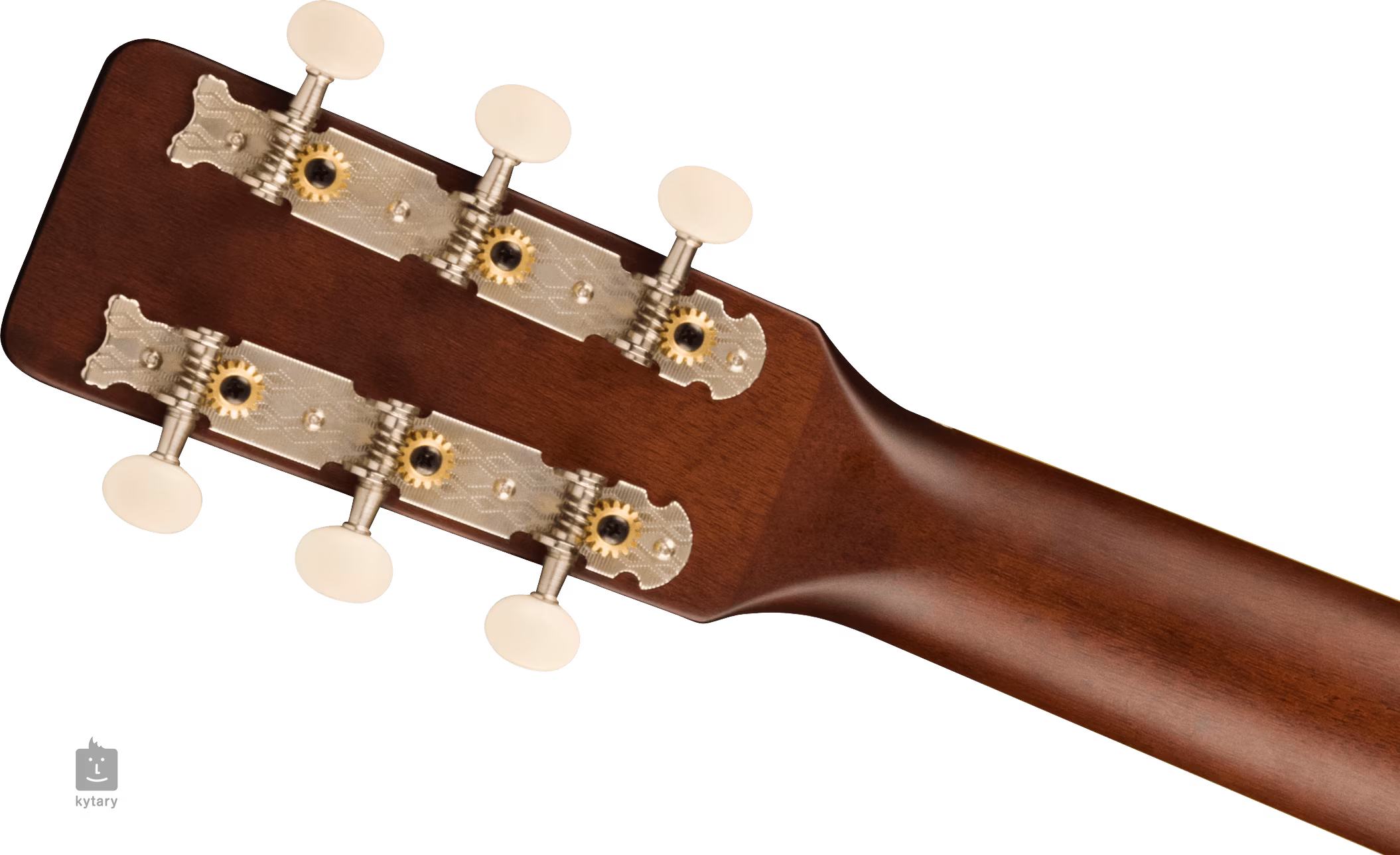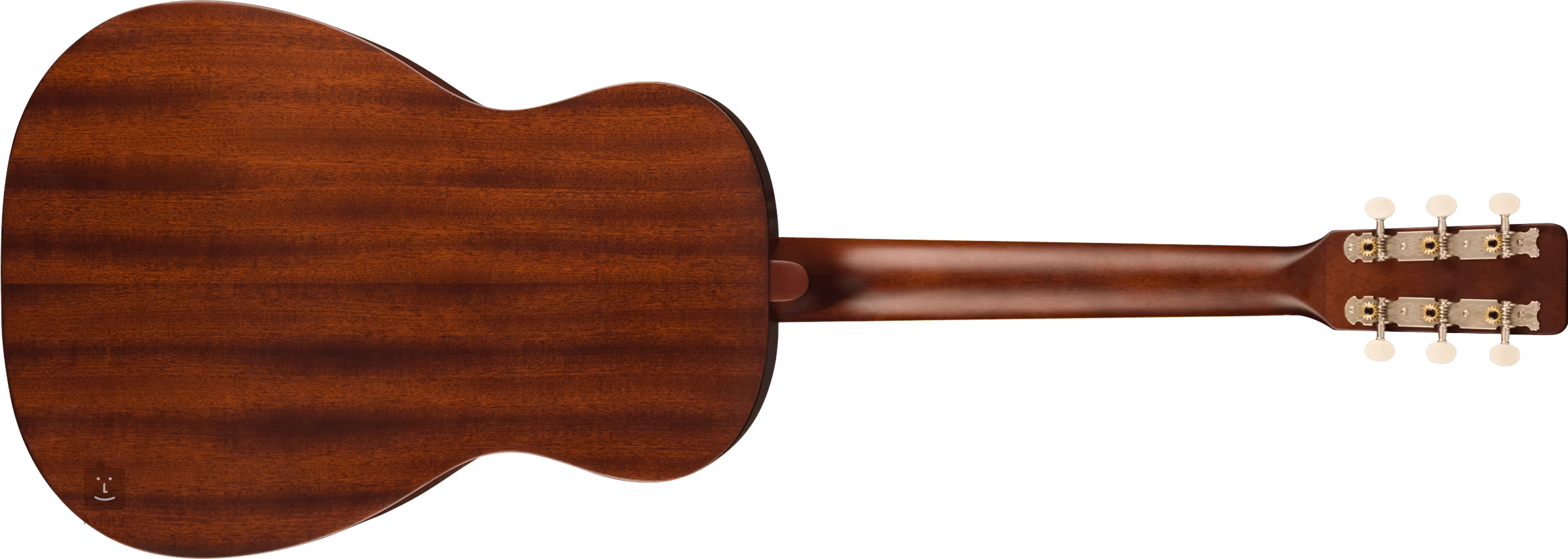 Der Korpus der Jim Dandy Parlor Frontier Stain ist aus laminiertem Sapele gefertigt. Ein Nato-Hals mit einem ansprechenden C-Profil ist am zwölften Bund mit dem Korpus verbunden. Die gute Resonanz des Korpus wird durch die traditionelle X-Riffelung unterstützt, während die Orientierung auf der Griffbrettoberfläche durch Positionspunkte aus Perlmuttimitation erleichtert wird. Die Saiten werden über den Nullbund und einen kompensierten Sattel aus synthetischem Knochen in offener Druckgussmechanik und einer Walnusskopfplatte befestigt. Der stilvolle Look der Gitarre wird durch ein gebeiztes Finish der Decke, ein einlagiges Schlagbrett und eine Randeinfassung in Aged White sowie Nickel-Hardware unterstrichen.