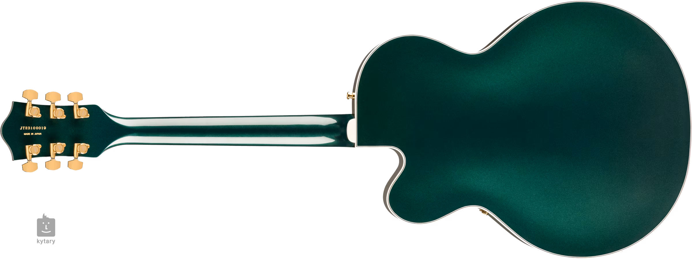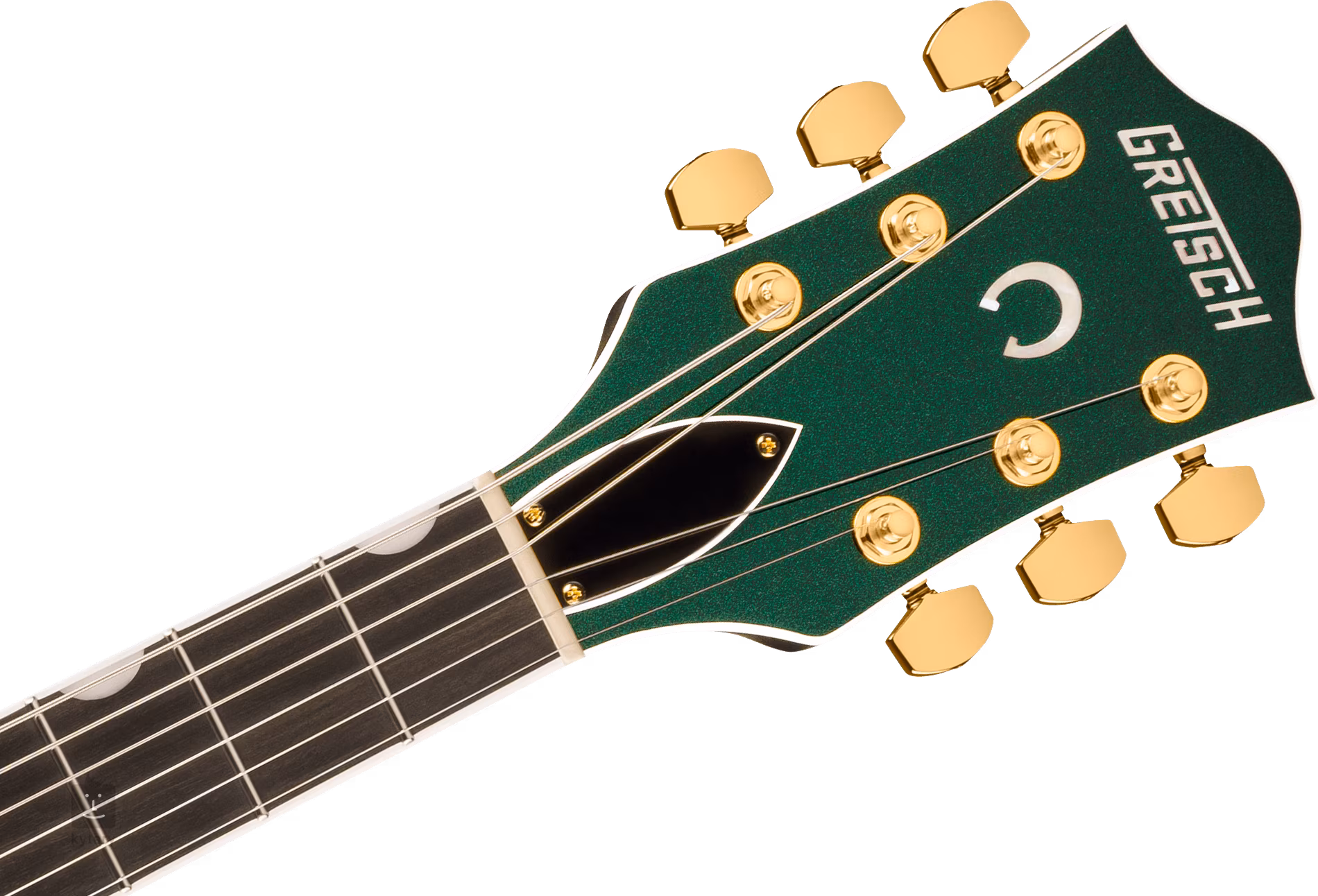 Die Saiten sind in abschließbaren Stimmmechaniken der renommierten Marke Gotoh über einen Graphtech TUSQ XL Nullbund und in Bigsby B6GP Tremolo über ein Adjusto-Matic Ebenholzgriffbrett montiert. Die schöne Verarbeitung wird durch die Goldlackierung aller Hardware, das goldene Plexi-Schlagbrett mit schwarzem Gretsch-Logo und das weiße Perimeter-Binding mit schwarzer und weißer Zierlinie unterstrichen.
