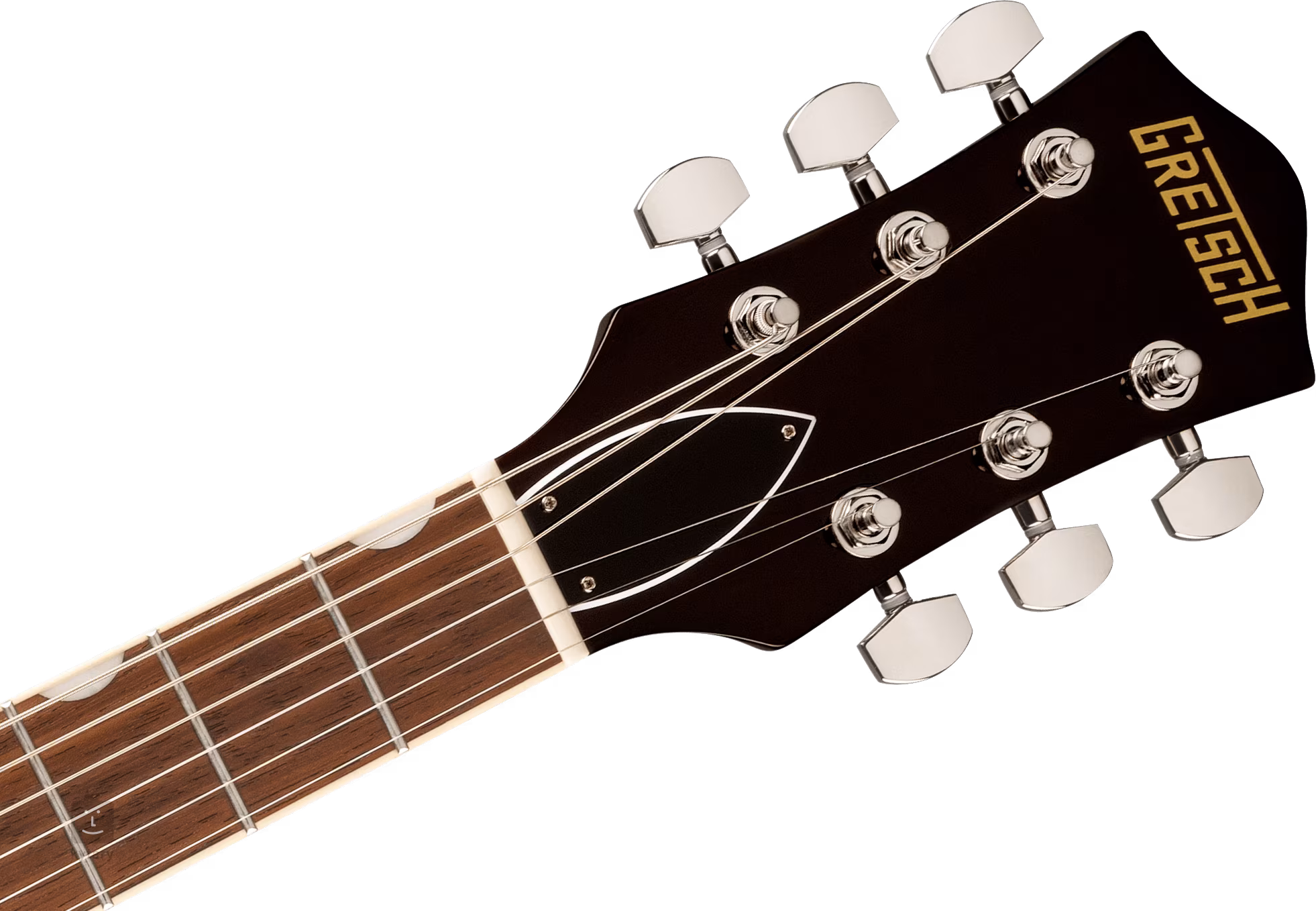 Die Jet Club unterscheidet sich von den Junior-Modellen durch zwei neu entwickelte Twin Six Humbucker. Mit den Lautstärke- und Tonreglern und dem dreistufigen Pickup-Schalter lässt sich der Klangcharakter einstellen. Eine stabile Stimmung wird durch die Befestigung der Saiten über den Knochen-Nullbund in den hauseigenen Druckguss-Stimmmechaniken und in den verstellbaren Wrap-Around-Saitenhaltern gewährleistet. Die schöne Verarbeitung wird durch Nickel-Hardware, helles Binding (aged white) und ein Schlagbrett aus Schildpatt-Imitat mit goldenem Gretsch-Logo akzentuiert.