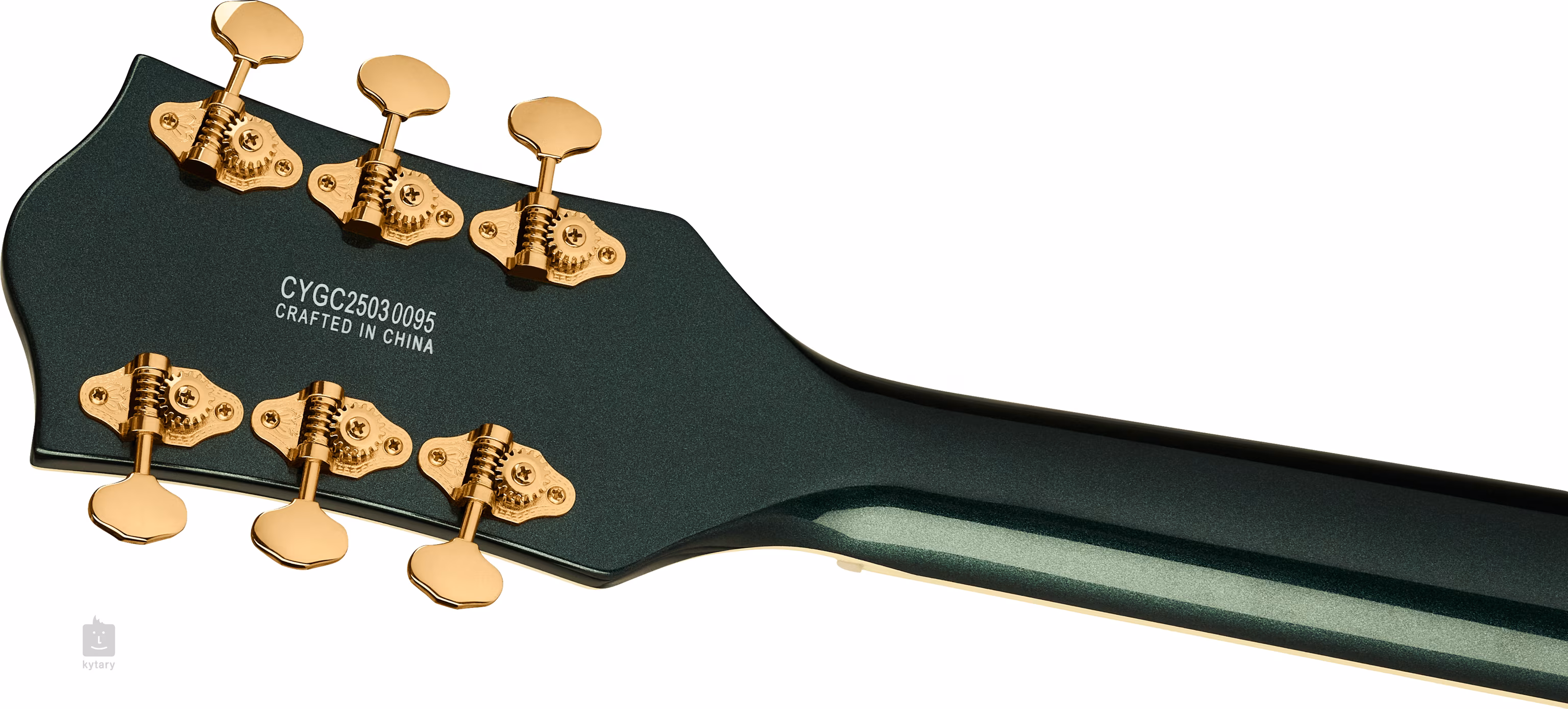 Das Modell Synchromatic Nashville Hollow Body Single-Cut with Bigsby EB Cadillac Green führt das Design der klassischen Gretsch 6120 lubes in völlig neue Gefilde. Es ist ein 24,6" (625 mm) großer, 2,5" (64 mm) tiefer Korpus aus laminiertem Ahorn. Die Vorder- und Rückseite sind gewölbt, und die Resonanz des Instruments wird durch Semi-Arc-Rippen unterstützt. Auf den Ahornhals mit einem angenehmen Soft-C-Profil ist ein Ebenholzgriffbrett mit zweiundzwanzig Medium-Jumbo-Bünden geleimt. Die Positionsmarkierungen aus Perlmuttimitat (Neo-Classical Thumbnail) erleichtern die Orientierung auf dem Griffbrett.