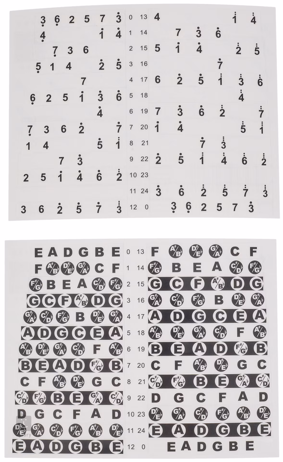 Griffbrettaufkleber für Gitarre oder Bass, damit Sie sich die Noten und Tonleitern auf dem gesamten Griffbrett merken können. So können Sie sofort üben und müssen sich keine Gedanken über die Theorie machen - das geht mit diesem Hilfsmittel ganz von selbst. Dieses Instrument eignet sich nicht nur für alle Anfänger, sondern auch für Lehrer oder erfahrene Spieler, die die Theorie auffrischen wollen.