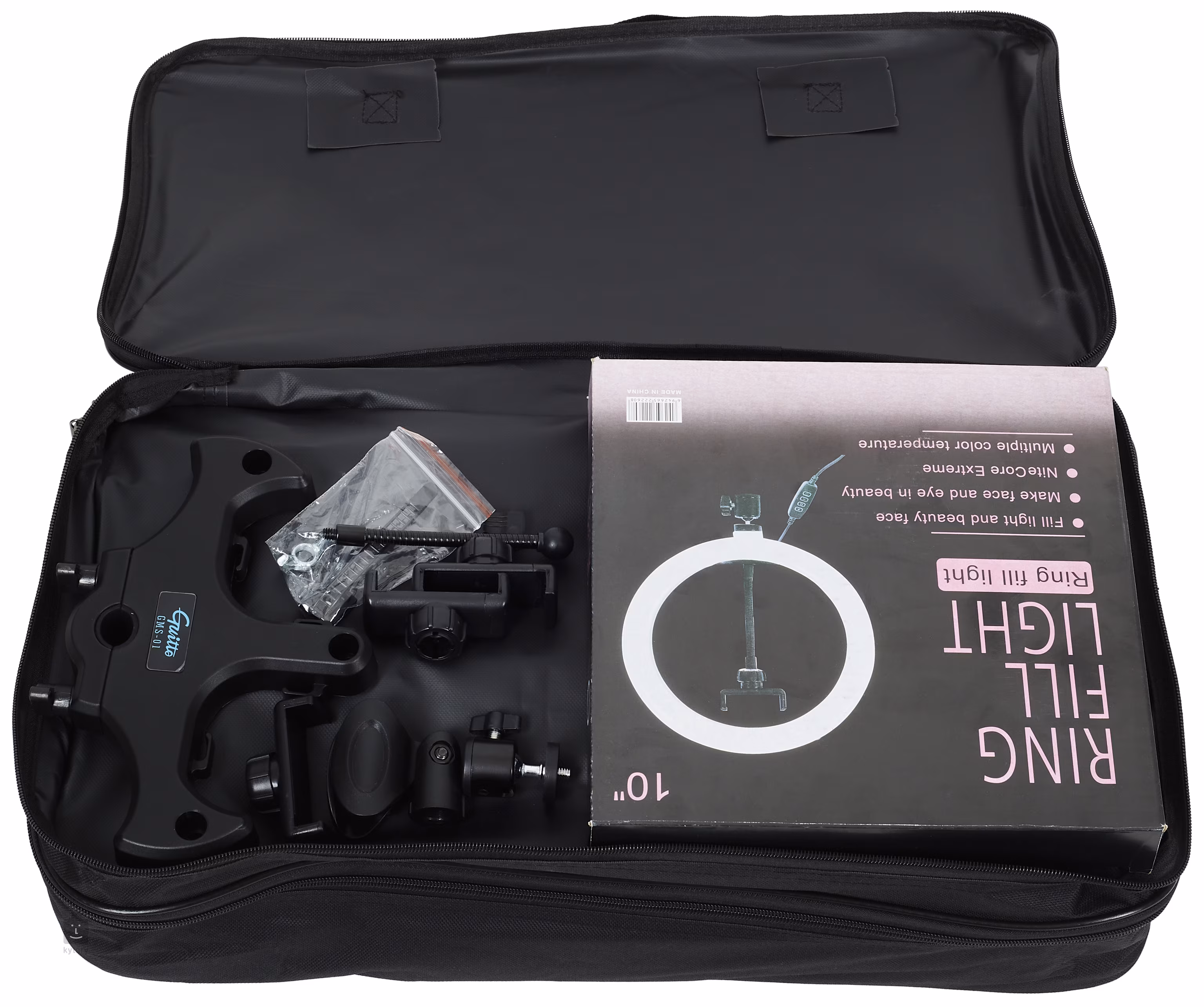 Der GMS-01 Live-Streaming-Mikrofonständer ist ein Mehrzweck-Mikrofonständer mit einem stabilen Dreibeinfuß, verstellbarer Höhe, Halterungen für drei Telefone für Live-Streaming auf bis zu drei Plattformen gleichzeitig, dimmbarer Beleuchtung in Form eines 10-Zoll-Rings, einem Notenständer und einer praktischen Basis/Theke zur Ablage von Gegenständen, Getränken usw.