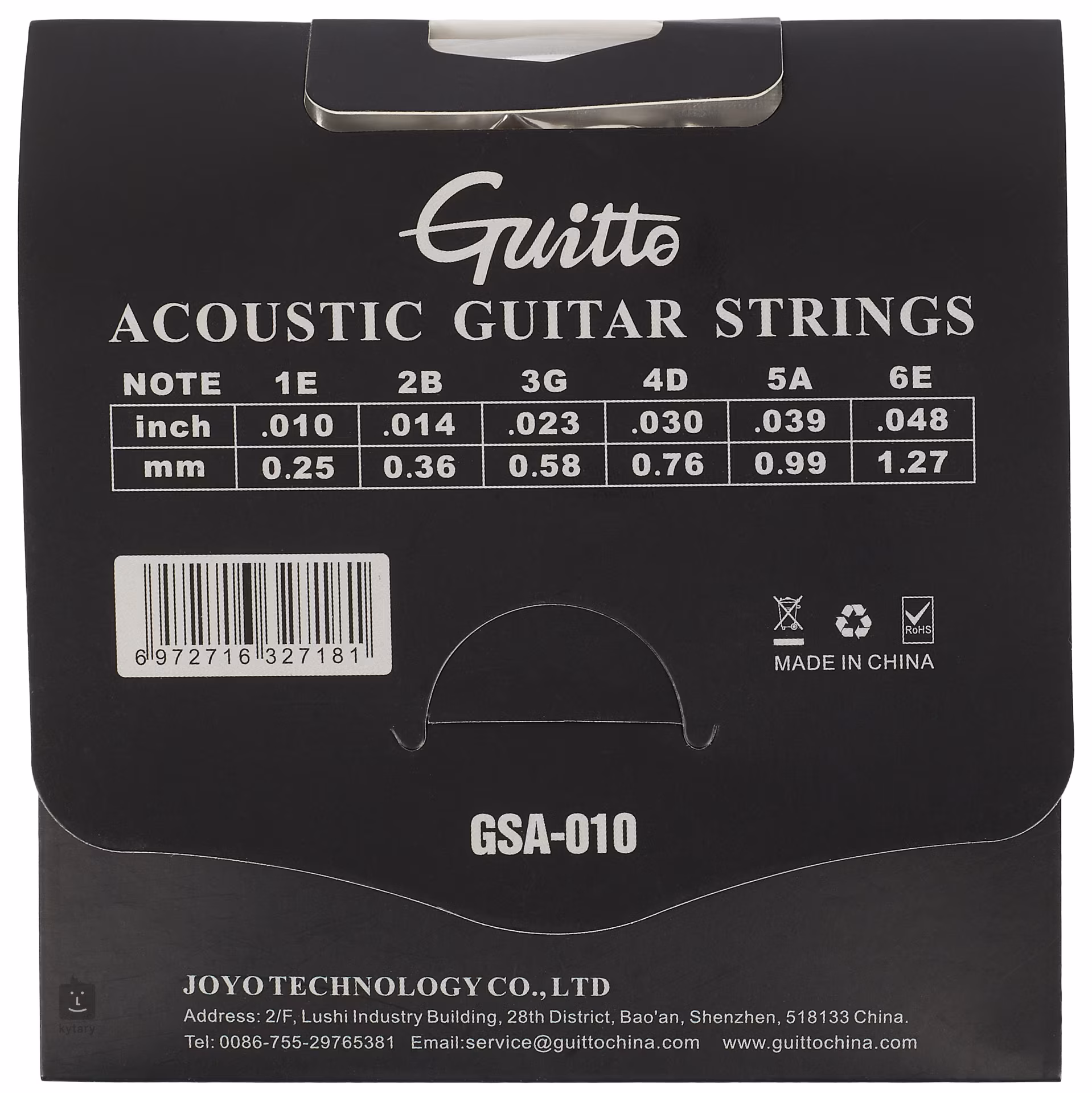 Diese Guitto-Metallsaiten sind für sechssaitige Akustikgitarren geeignet. Die Mischung aus Stahl und Karbon verleiht ihnen einen druckvollen, klaren Ton, der sich hervorragend für das Spiel in einer Band eignet. Der sechseckige Kern macht sie widerstandsfähig gegen Risse und die spezielle Beschichtung sorgt für eine lange Lebensdauer und Schutz vor Korrosion. Die Härte 10-48 eignet sich für Anfänger, die weichere Saiten suchen, oder für fortgeschrittene Gitarristen, die biegsamere Saiten für leichtes Bending und schnelle Soli benötigen.