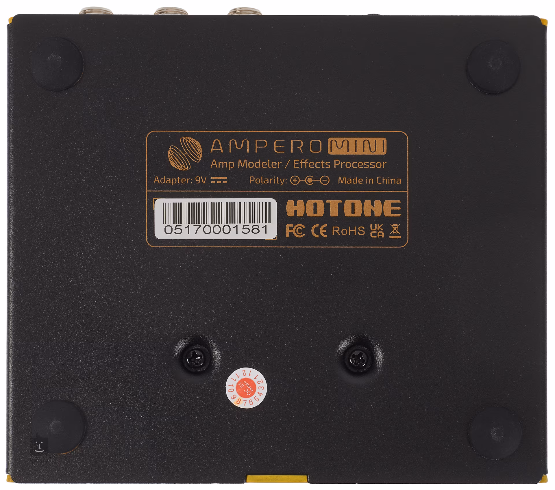 An Ein- und Ausgängen bietet der Hotone Mini einen Stereo-/Mono-Ausgang des Multieffekts (für Stereoanschlüsse wird ein Y-Kabel benötigt, um die Ausgangskanäle zu splitten), einen Eingang für ein externes Expression-Pedal, einen Aux-In-Eingang, einen Kopfhörerausgang und den bereits erwähnten USB-Anschluss. Das Gehäuse des Multieffekts ist aus Aluminium gefertigt. Die Stromversorgung erfolgt über den mitgelieferten 9V-Adapter.