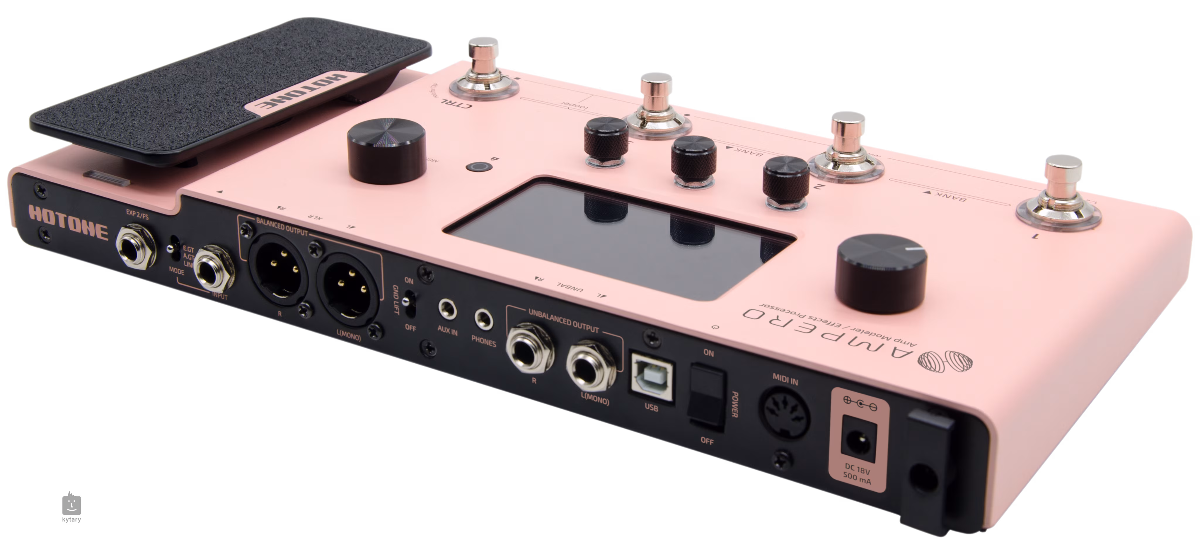 Ampero ist ein Gitarren-Multieffekt der asiatischen Marke Hotone, der problemlos das gesamte Gitarren-Rig ersetzen kann. Er bietet 242 Gitarreneffekte aus der XTOMP-Datenbank (64 Instrumentenmodulationen, 60 Cabinet-Simulationen, über 100 Sounds bekannter Pedaleffekte, original Hotone-Designs, Akustikgitarren- und Mikrofonsimulationen und -einstellungen), 198 Presets (99 Factory, 99 User), eine eingebaute Drum-Maschine mit 100 Rhythmus-Patterns, einen Looper mit 100 Sekunden Aufnahmezeit in Mono (50 in Stereo) und ein integriertes Expression-Pedal. Mit einem dreistufigen Schalter für das elektrische/akustische/FX-Eingangssignal kann der Multieffekt nicht nur mit elektrischen Gitarren und Bässen, sondern auch mit elektroakustischen Gitarren oder Keyboards verwendet werden.