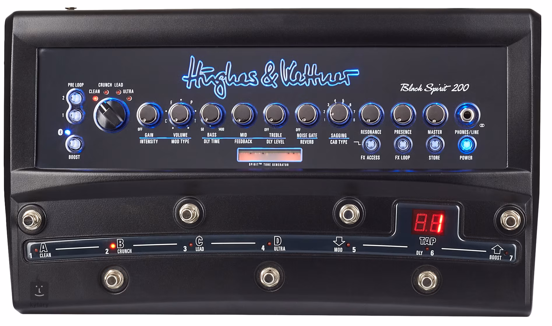 Der integrierte MIDI-Schalter/das MIDI-Board arbeitet in drei Modi: Preset-Modus (32 Bänke mit jeweils vier Presets), Stomp-Box-Modus und Direct-7-Modus (direkter Zugriff auf 7 von 128 Presets, die den einzelnen Fußschaltern zugewiesen sind). Der Effektbereich mit integrierten Effekten (Delay, Reverb, Chorus, Phaser, Flanger, Tremolo) und acht Cabinet-Simulationen kann über den FX Access-Schalter aufgerufen werden. Die Auswahl und Bearbeitung der Parameter erfolgt über Standardregler. Alle Parameter (außer der Master-Lautstärke) können mit der Store-Taste gespeichert werden (bis zu 128 Presets) und jederzeit mit den Fußschaltern wieder aufgerufen werden. Jeder Kanal kann durch Drücken der Boost-Taste klanglich noch mehr „angeheizt” werden.