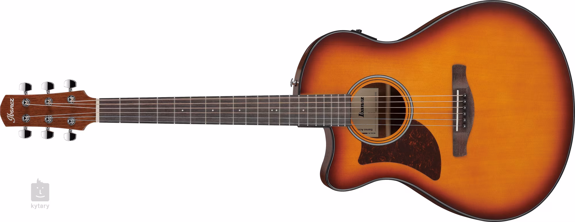 Die Saiten sind in verchromten Druckguss-Zahnrädern mit einer Übersetzung von 18:1 und einem Griffbrett aus Purpleheart montiert. Die Ibanez Advantage-Wirbel bieten gegenüber den Standardmodellen Vorteile in Bezug auf die einfache Handhabung und die feste Saitenbefestigung. Der stilvolle Look des Instruments wird durch das Open Pore Light Brown Sunburst-Finish der Decke und traditionelle Elemente in Form einer schwarzen Korpuseinfassung, einer Rosette aus schwarzen und weißen Ringen und einem Schlagbrett aus Schildpatt-Imitat unterstrichen.