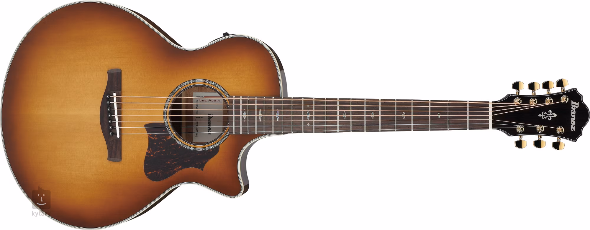 Die Saiten sind in Druckgussgetrieben mit einer Übersetzung von 18:1 und einem Palisandergriffbrett mit Knochengriffbrett und kompensiertem Sattel montiert. Die Ibanez Advantage-Wirbel bieten gegenüber den Standardmodellen Vorteile in Bezug auf die einfache Handhabung und die feste Saitenbefestigung. Die stilvolle Verarbeitung wird durch die weiße Korpuseinfassung, eine Rosette aus Holz und Perlmuttringen (Abalone) sowie Positionsmarker aus Ahorn und Perlmutt unterstrichen.