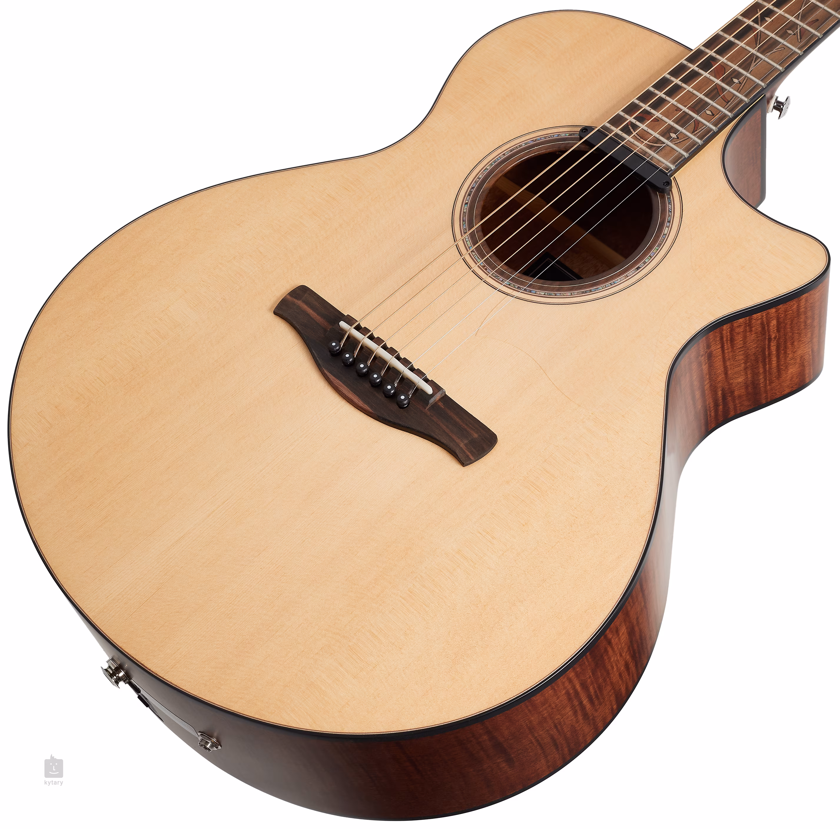Das Modell AE325-LGS ist mit einer massiven Sitka-Fichtendecke ausgestattet, während Boden und Zargen aus furniertem Okoumé mit attraktiver Holzmaserung gefertigt sind. Sorgfältig entworfene, reduzierte X-M-Rippen und die Anordnung der Rippen sorgen für eine effiziente Übertragung der Saitenschwingungen über das Griffbrett auf den Korpus. Auf den Hals, der aus fünf Teilen Mahagoni und Pau Ferro besteht, ist ein Makassar-Griffbrett aus Ebenholz geklebt, das mit zwanzig Jumbo-Bünden ausgestattet ist. Das schmale "C"-Profil des Halses und die abgerundeten Kanten des Griffbretts bieten dem Spieler einen höheren Spielkomfort, und dank der Leuchtpunkte an der Seite sind die Bewegungen auf dem Griffbrett auch in dunklen Umgebungen mit Hintergrundbeleuchtung perfekt zu erkennen.