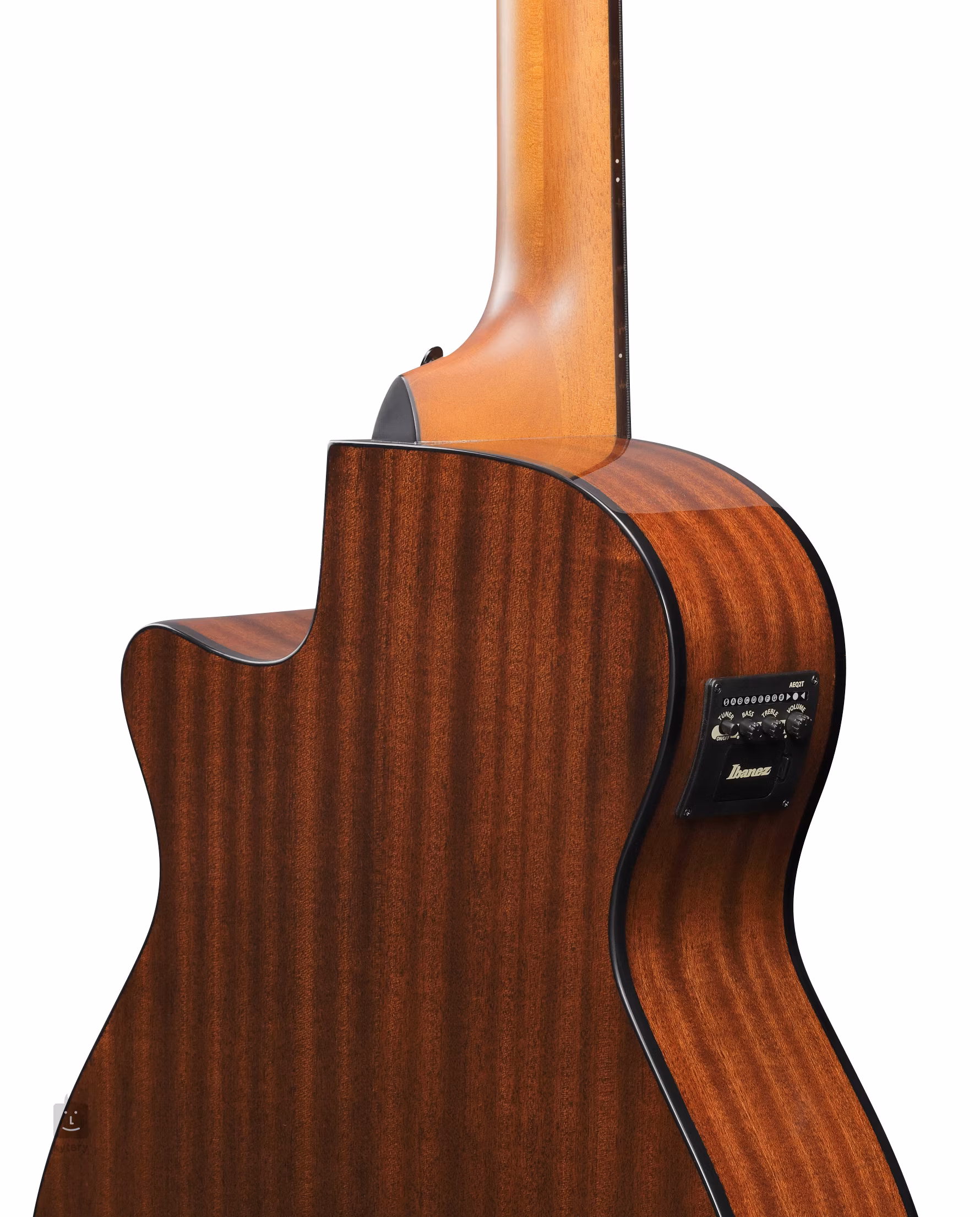 Die elektroakustische Bassgitarre AEGB25E Transparent Black gehört zu den Instrumenten der AE-Serie, die dank ihres größeren Korpus wie geschaffen für Live-Auftritte sind – sowohl akustisch als auch nach dem Anschließen an eine Anlage. Selbstverständlich zeichnen sich diese Instrumente durch eine sehr gelungene Verarbeitung und einen Klang aus, den man eher von wesentlich teureren Instrumenten erwarten würde. Die Decke des Instruments besteht aus laminiertem geflammtem Ahorn, der Boden und die Zargen sind aus laminiertem Sapeli gefertigt. Die Maserung des geflammten Ahorns wird durch den glänzenden Lack und die Farbgebung Transparent Black hervorgehoben, während die natürliche Verarbeitung und der glänzende Lack des Bodens und der Zargen die Maserung des Sapeli zur Geltung bringen. Der Hals aus drei Stücken Nyatoh und Ahorn ist mit einem Palisandergriffbrett mit 21 Bünden versehen. Die Saiten sind in firmeneigenen Die-Cast-Mechaniken und einem geformten Palisandersteg befestigt. Für Komfort beim Spielen sorgt ein Daumenauflage aus Merbau-Holz. Die Tonabnahme erfolgt über einen Untersteg-Piezo-Tonabnehmer, ergänzt durch die Ibanez AEQ-2T-Elektronik, die Ihnen neben einem integrierten Stimmgerät auch einen Zweiband-Equalizer und eine Lautstärkeregelung bietet.