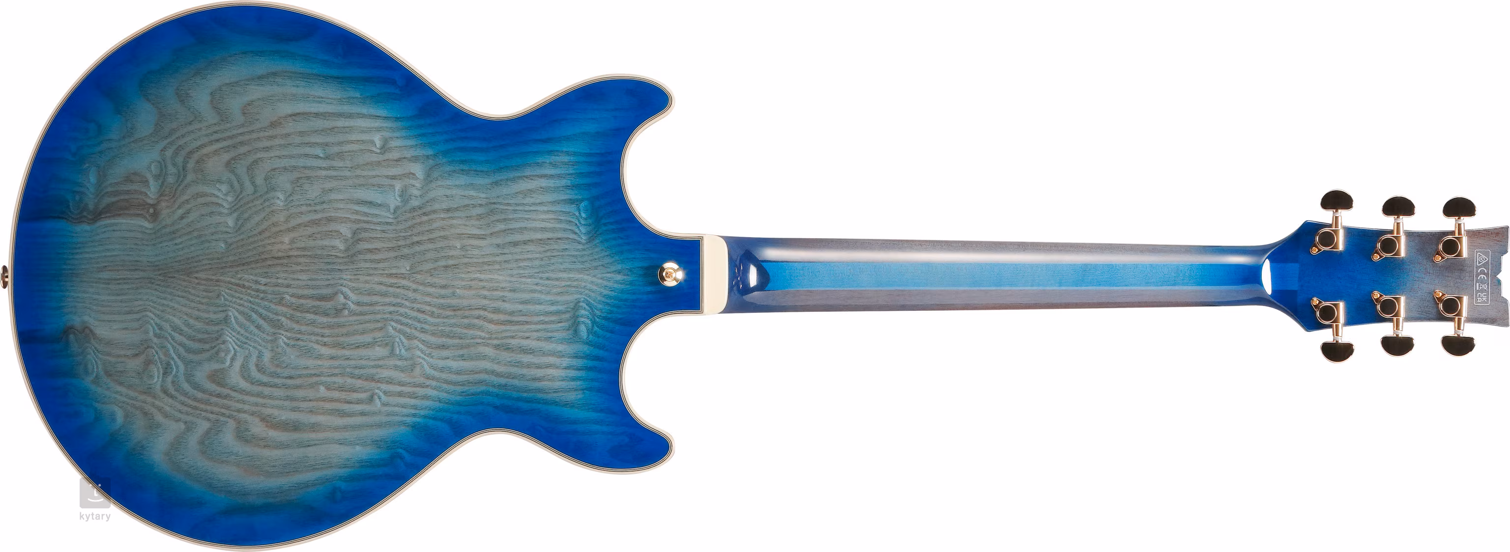 Die Decke der Gitarre besteht aus laminiertem Quilted Ash. Die markante Maserung des Holzes wird durch einen glänzenden Polyurethanlack und die Farbgebung Jet Blue Burst hervorgehoben. Der Hals aus drei Stücken Ahorn und Nyatoh-Holz ist mit einem Griffbrett aus Makassar-Ebenholz mit 22 Medium-Bünden versehen. Die Orientierung auf dem Griffbrett erleichtern Positionsmarkierungen aus Perlmuttimitat.