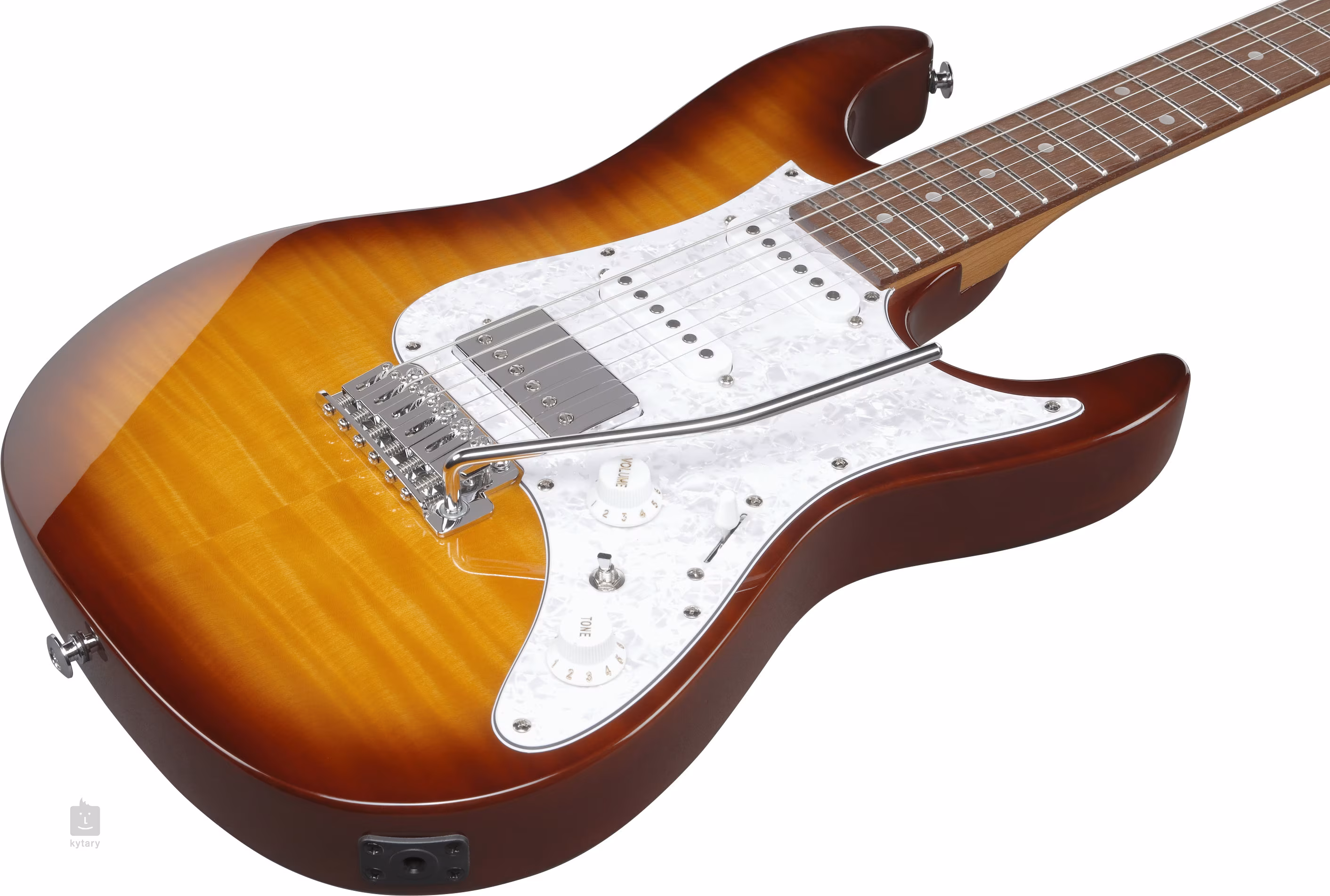 Die Saiten werden in verchromten, verriegelbaren Mechaniken und einem T106-Tremolo gehalten.