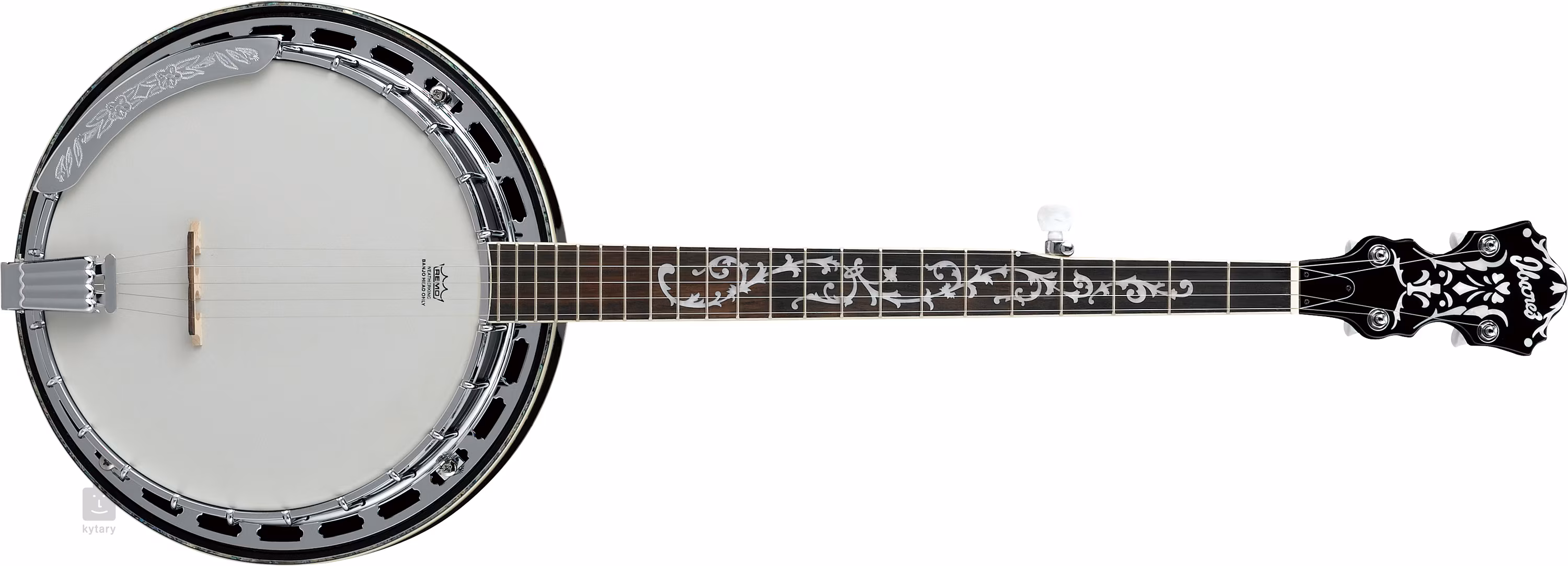 Das Ibanez B300 BK ist ein preisgünstiges fünfsaitiges Banjo mit einem ausreichend lauten Klang dank seines Walnuss-Resonanzkörpers, d. h. einer geschlossenen Rückwand. Das Instrumentverfügt über einen Tonring aus gerolltem Messing, einen Pappelkorpus und eine daran befestigte 11-Zoll-Felle mit Stahlrand, einen dekorativen Doppelring (Flansch), einen Okoumé-Hals und ein Griffbrett aus Purpleheart-Holz mit 20 Bünden. Die Griffbrettfläche ist mit einem Inlay im Weinblattdesign aus Perlmuttimitat verziert.