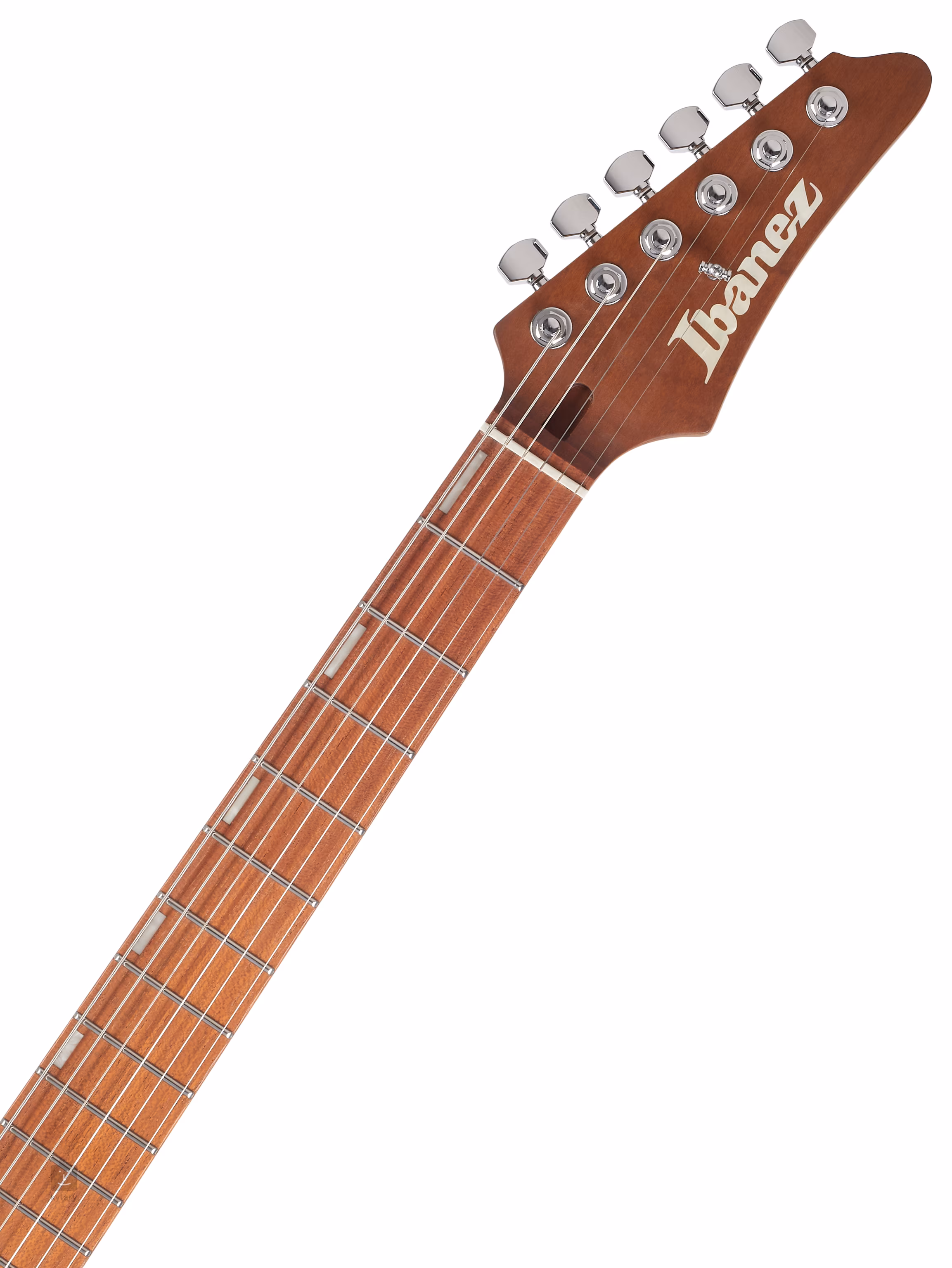 Der Korpus der Gitarre ist aus exotischem Nyato-Holz und einer Walnussdecke gefertigt. Der verschraubte Ahornhals ist mit einem Jatoba-Griffbrett mit vierundzwanzig Jumbo-Bünden aus rostfreiem Stahl verleimt. Der Hals wurde vor dem Zusammenbau einer Wärmebehandlung unterzogen, die die Eigenschaften des Holzes (Stabilität, Haltbarkeit, Widerstandsfähigkeit gegen Wasser und Temperaturschwankungen) verbessert und ihm durch die Nachdunkelung einen schönen Vintage-Charakter verleiht. Die Orientierung auf der Oberfläche des Griffbretts wird durch versetzte Positionsblöcke und Leuchtmarkierungen an der Seite erleichtert.
