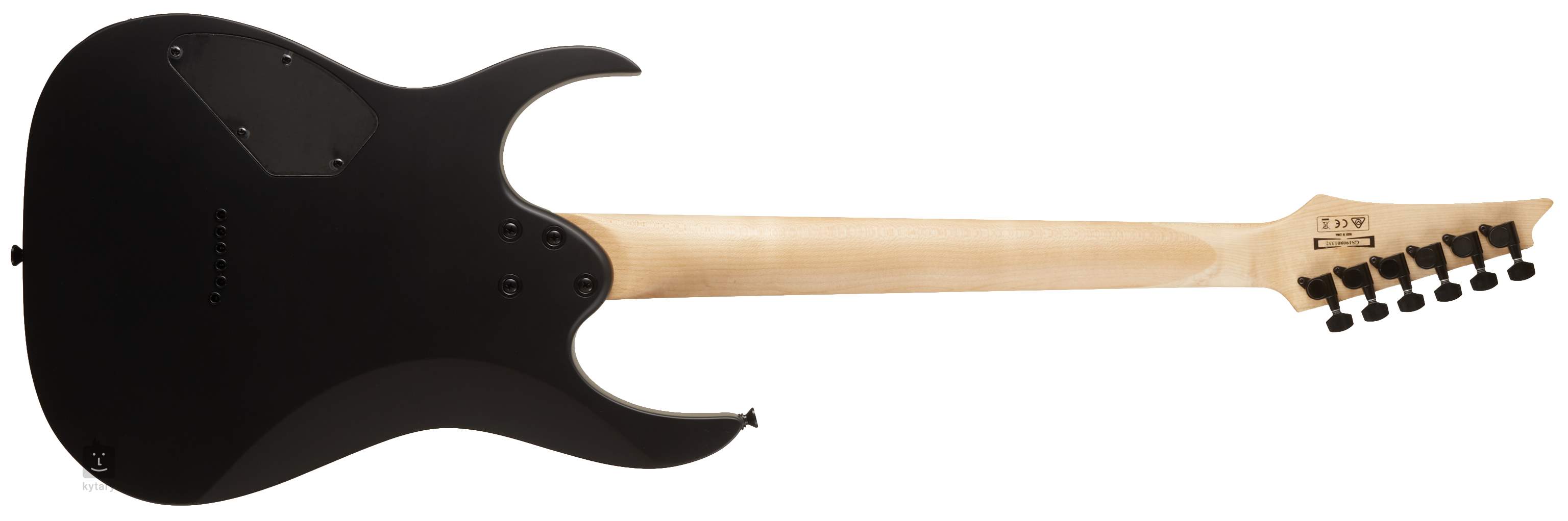 Der Korpus des GRG121DX-BKF ist aus Pappelholz gefertigt. Ein Griffbrett aus Purpleheart-Holz mit vierundzwanzig Jumbo-Bünden ist auf den Ahornhals geleimt. Positionsmarkierungen im Sharktooth-Design erleichtern das Navigieren auf der Oberfläche.